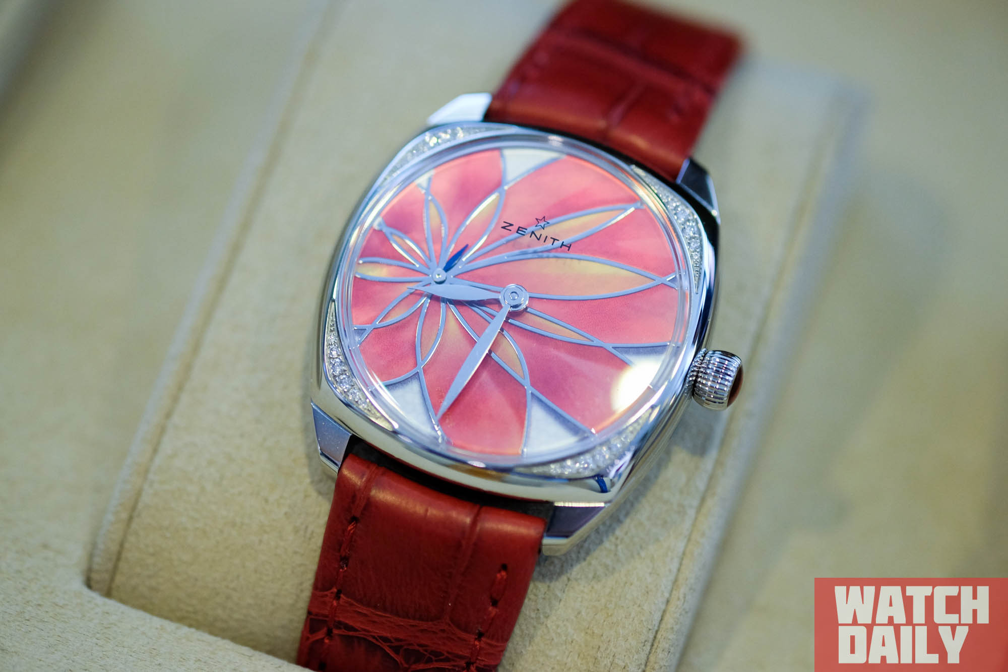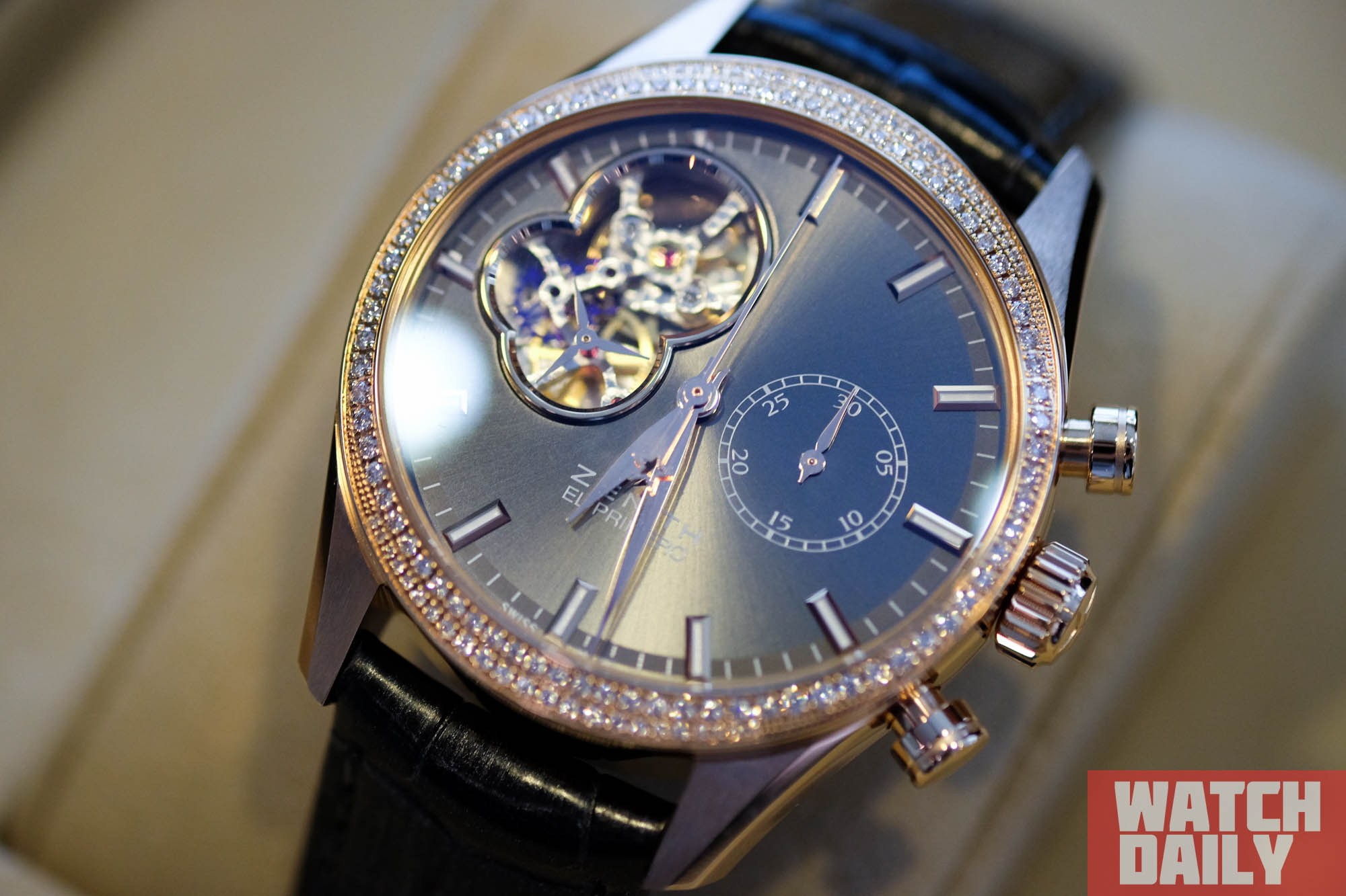 Внутри — калибр El Primero 4062 с кремниевым спуском, который, как и в мужских Хрономастерах, без труда просматривается в фирменном окне на циферблате.