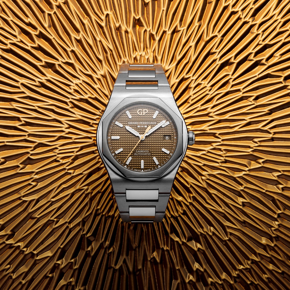 38-миллиметровые версии Laureato используют мануфактурный автоматический калибр GP03300-2034 с 4-герцовым балансом и запасом хода в 46 часов, полноформатный ротор которого выполнен из 18-каратного розового золота и отделан круговой фактурной шлифовкой.