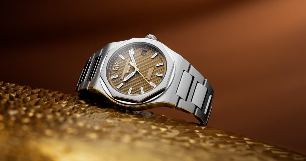 В тон циферблату, играющему разнообразными оттенками — от желтовато-коричневого к розово-золотому — подобраны также цвет накладных литер GP и центральной секундной стрелки.