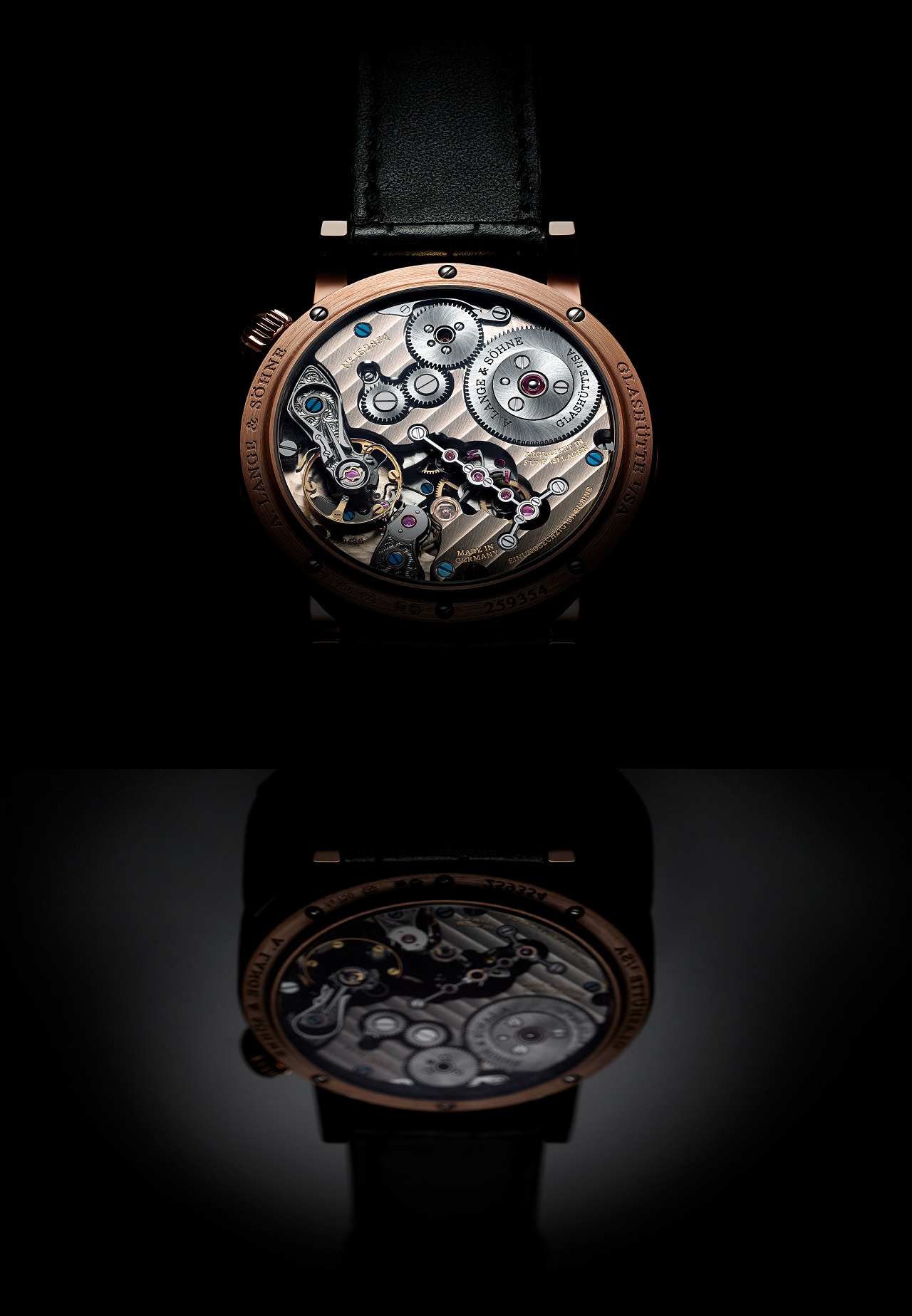 Разумеется, изделие предлагает традиционный для саксонского бренда высочайший уровень финишной отделки и декорирования механизма в виде сочетания нескольких типов фактурных шлифовок, полированных фасок, а также таких узнаваемых элементов как вороненые винты, полированная накладка на камень анкерного колеса или ручная гравировка цветочным мотивом.