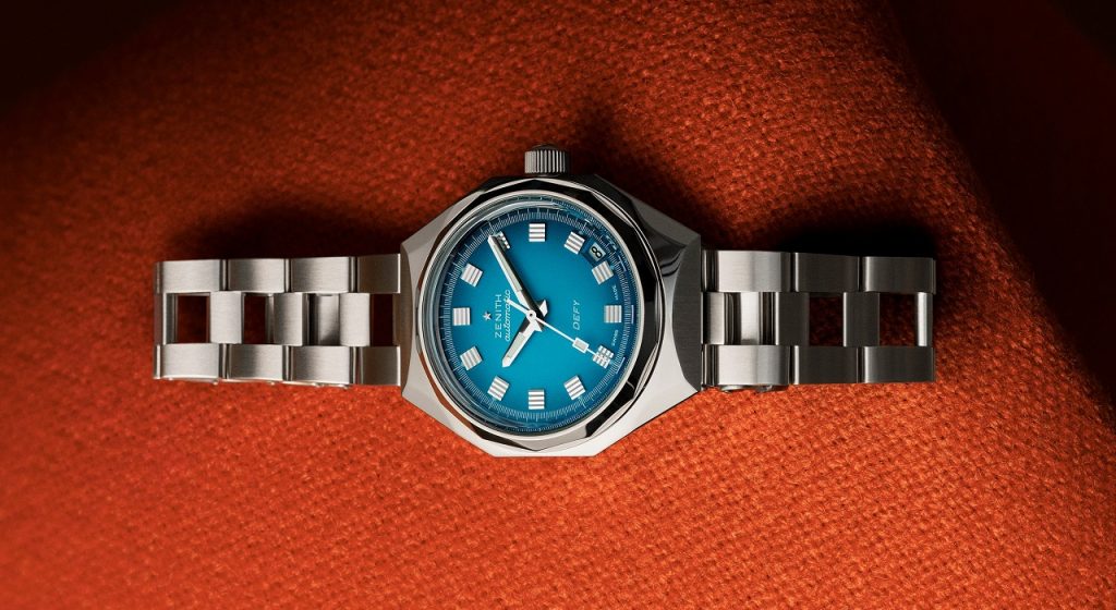 Градиентный циферблат, находящийся в обрамлении необычного четырнадцатигранного безеля, использует привлекательный бирюзово-синий оттенок, а накладные квадратные часовые метки имеют горизонтальные канавки, которые передают ощущение вечного движения, изящно взаимодействуя с широкими мечевидными указателями с люминофорным заполнением того же оттенка, что и тритий, использовавшийся в исторической модели.