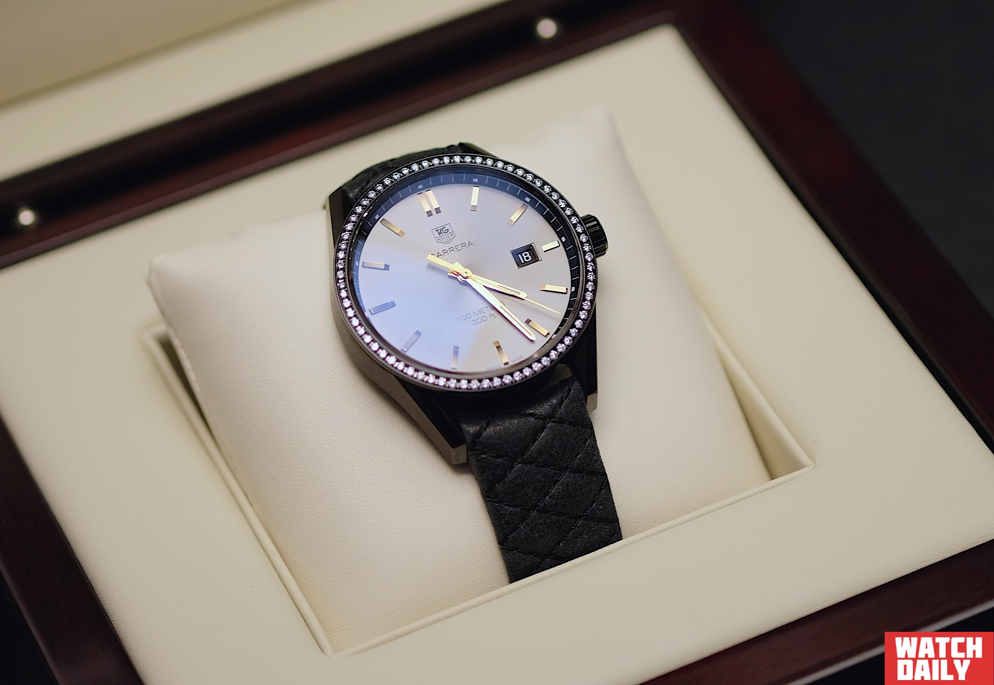 В заключение обзора — модель Carrera Cara Delevingne в честь новой посланницы швейцарского бренда. Признаться, мы впервые слышим имя Кары Делевинь и не сильно расстроимся, если не услышим его более никогда, но часы получились очень стильными. Все тоже черное покрытие из карбида титана поверх стального корпуса диаметром 41 мм, антрацитовый циферблат с золотистыми накладными метками и стрелками и черный стеганый ремень из телячьей кожи. И все это сочетание может быть дополнено черными же бриллиантами по безелю в количестве 72 штук. Впрочем, версия с обычными бриллиантами так же хороша.