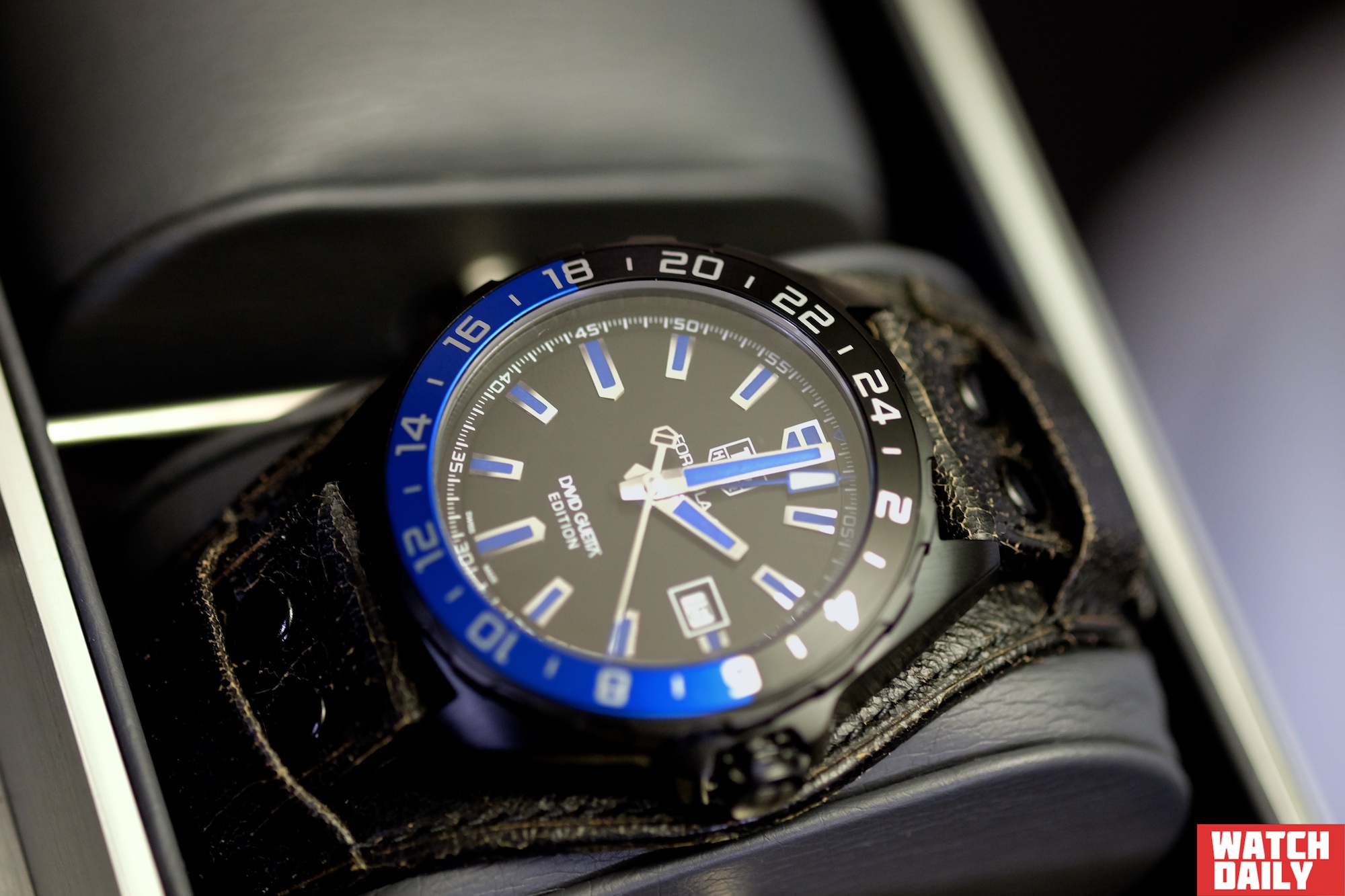 Если вы по каким-то причинам не являетесь футбольным фанатом, но любите современную электронную музыку, возможно модель Formula 1 David Guetta будет более оправданным выбором. Часы выполнены в стальном 43 мм корпусе с черным покрытием из карбида титана, выдержаны в черно-синей гамме и поставляются на широком ремне из телячьей кожи с напульсником. За индикацию показаний отвечает калибр 7 с функцией GMT и автоподзаводом.