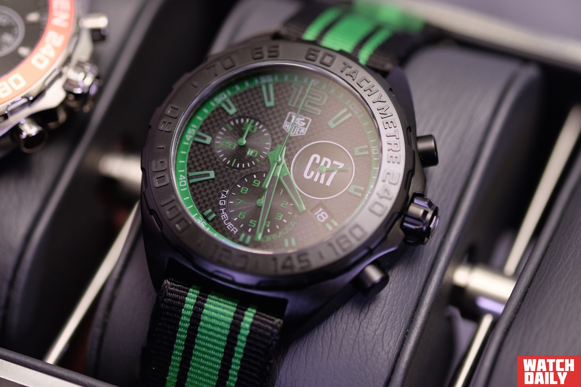 Аналогичный механизм установлен и в другой модели — Formula 1 CR7, где последние три символа скрывают имя, фамилию и номер футболки известного португальского футболиста Криштиану Роналду. Оказывается, зеленый цвет является символом этого атлета и обозначает то ли цвет травы футбольного поля, то ли один из основных цветов португальского флага. В тематической модели он непостижимым образом сочетается с черным цветом карбид-титанового покрытия стального 42 мм корпуса, что служит удивительным доказательством «мужского» характера часов.