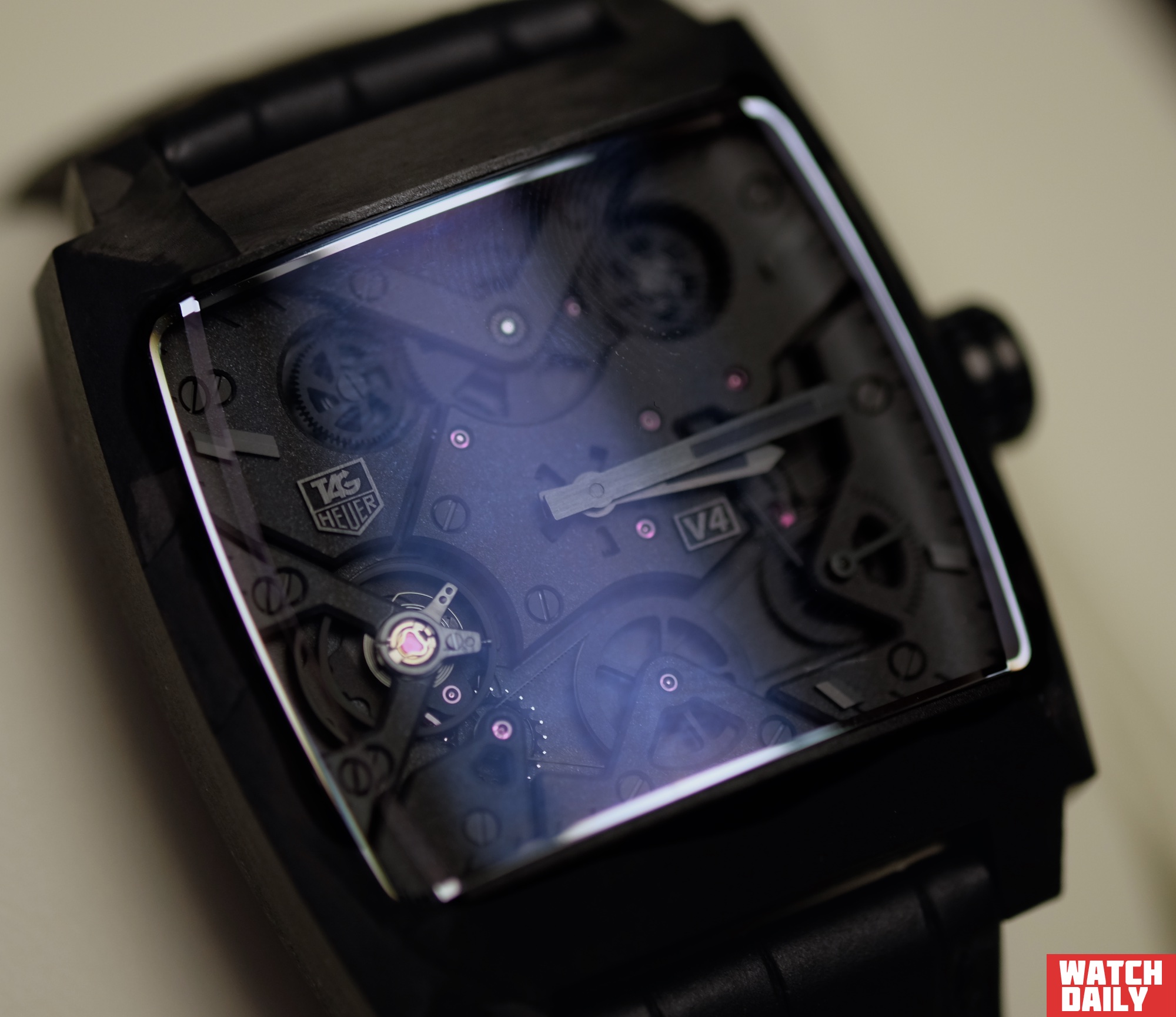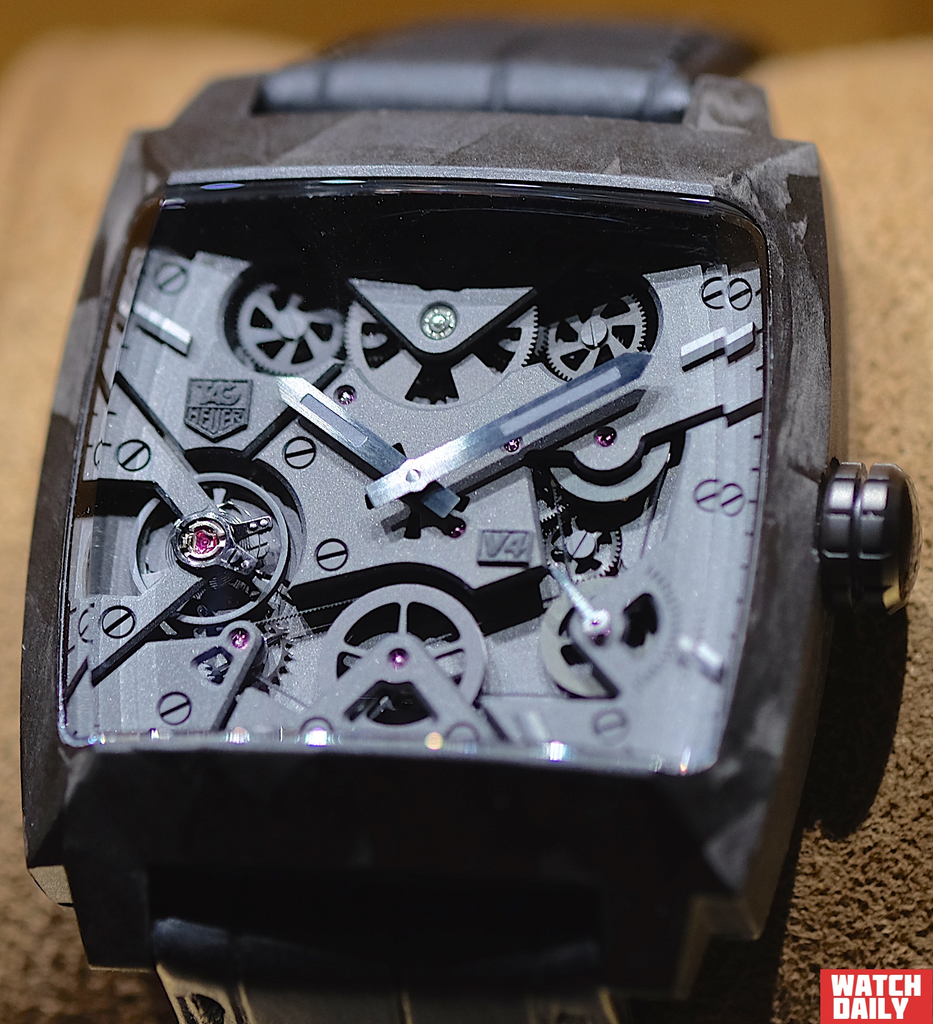 Пожалуй, рассказ стоит начать с концепции Monaco V4, первая модель которой была представлена еще в 2004 году. На сей раз часы в прямоугольном корпусе 41 х 41 мм выполнены из композитного материала с углеродной матрицей CMC (Carbon Matrix Composite). Более того, из этого же материала изготовлены и 7 мостов калибра, получившего свою известность за счет микроскопической зубчатой ременной передачи с линейным инерционным грузом. Часы получили обозначение Monaco V4 Phantom.