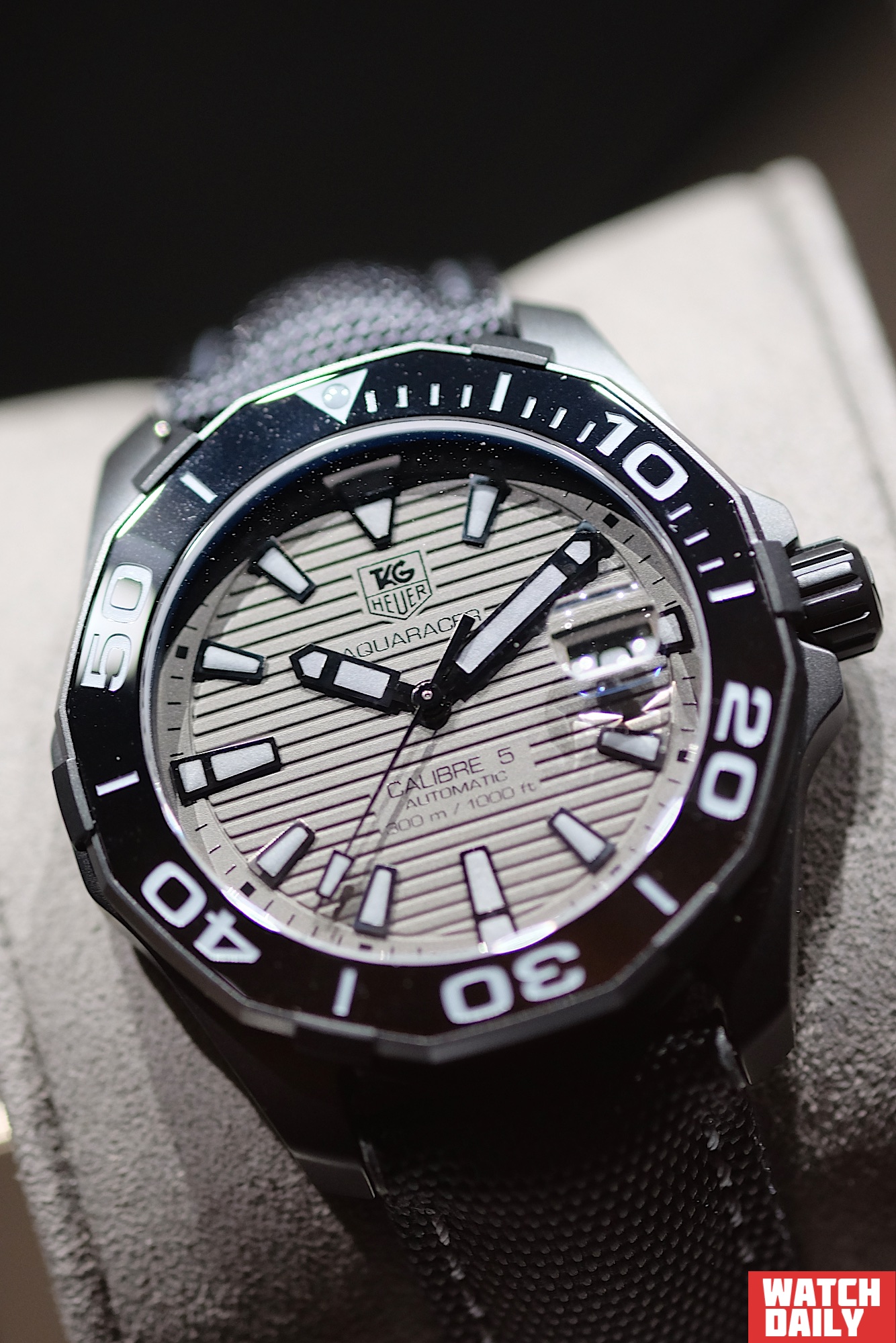 На циферблате присутствуют только оттенки темно-серого и черного цветов, почти все элементы (платина, стрелки, накладные метки, винты и колеса) имеют мелкозернистую фактуру покрытия из карбида титана. Аналогичным способом изготовлена и заводная коронка.