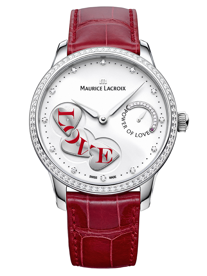 Среди многообразия новых часов, которые расширили и без того богатую видовую коллекцию марки Maurice Lacroix на прошедшем Базельском салоне-2015, нельзя не отметить новую женскую модель Power of Love, представляющую топовую для компании линию Masterpiece. Не смотря на женский характер модели, часы предлагаются в относительно крупном 43 мм корпусе из нержавеющей стали, безель которых инкрустирован 72 бриллиантами общим весом 0.75 карат.