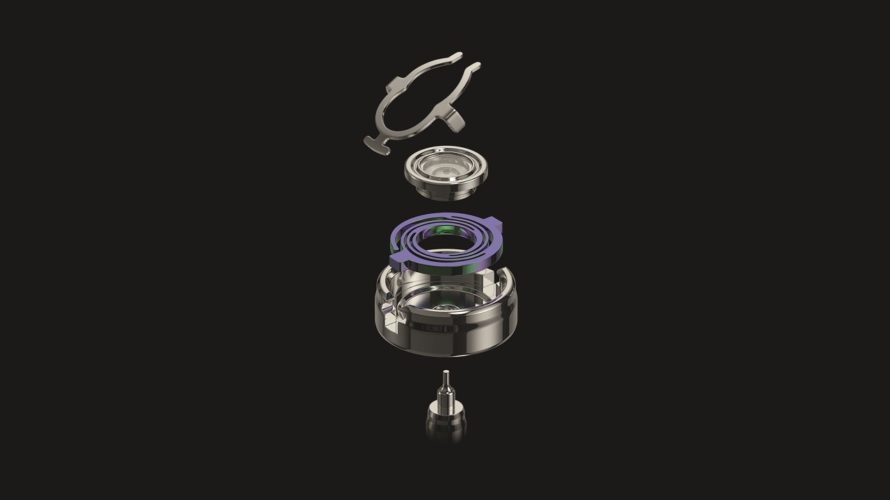 По сравнению с классической противоударной системой, состоящей из пяти элементов, мануфактурная разработка инженеров из Ле Локля содержит уникальный амортизирующий элемент из кремния, заменяющий три из них.