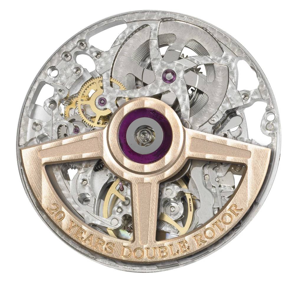 Впрочем, юбилейная модель 2015 года, First Class Double Rotor Skeleton, оказалась на редкость традиционной, разве что сам ротор с центральным креплением выглядит нарочито крупно и нарядно, а часть циферблата под ним скелетонирована.