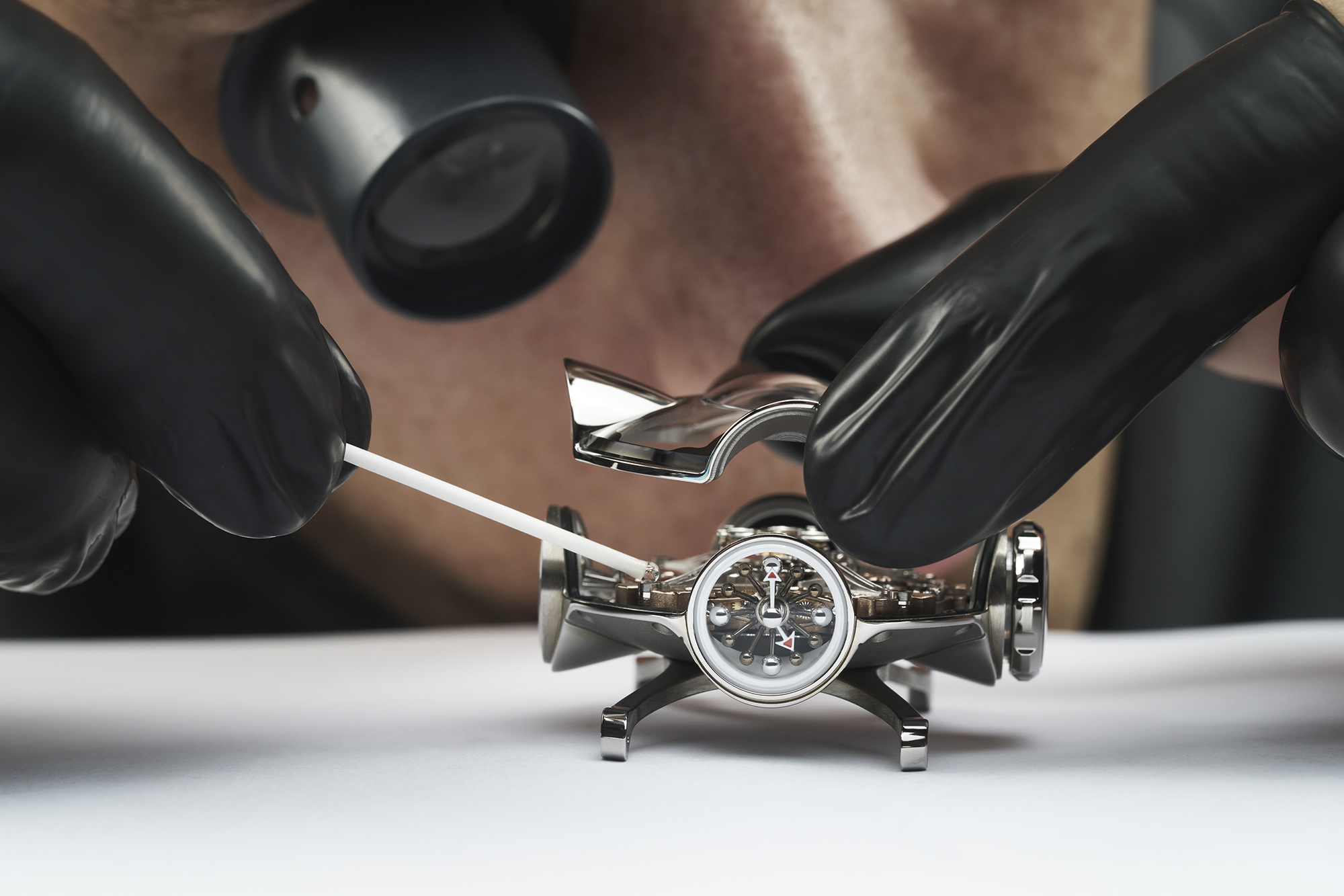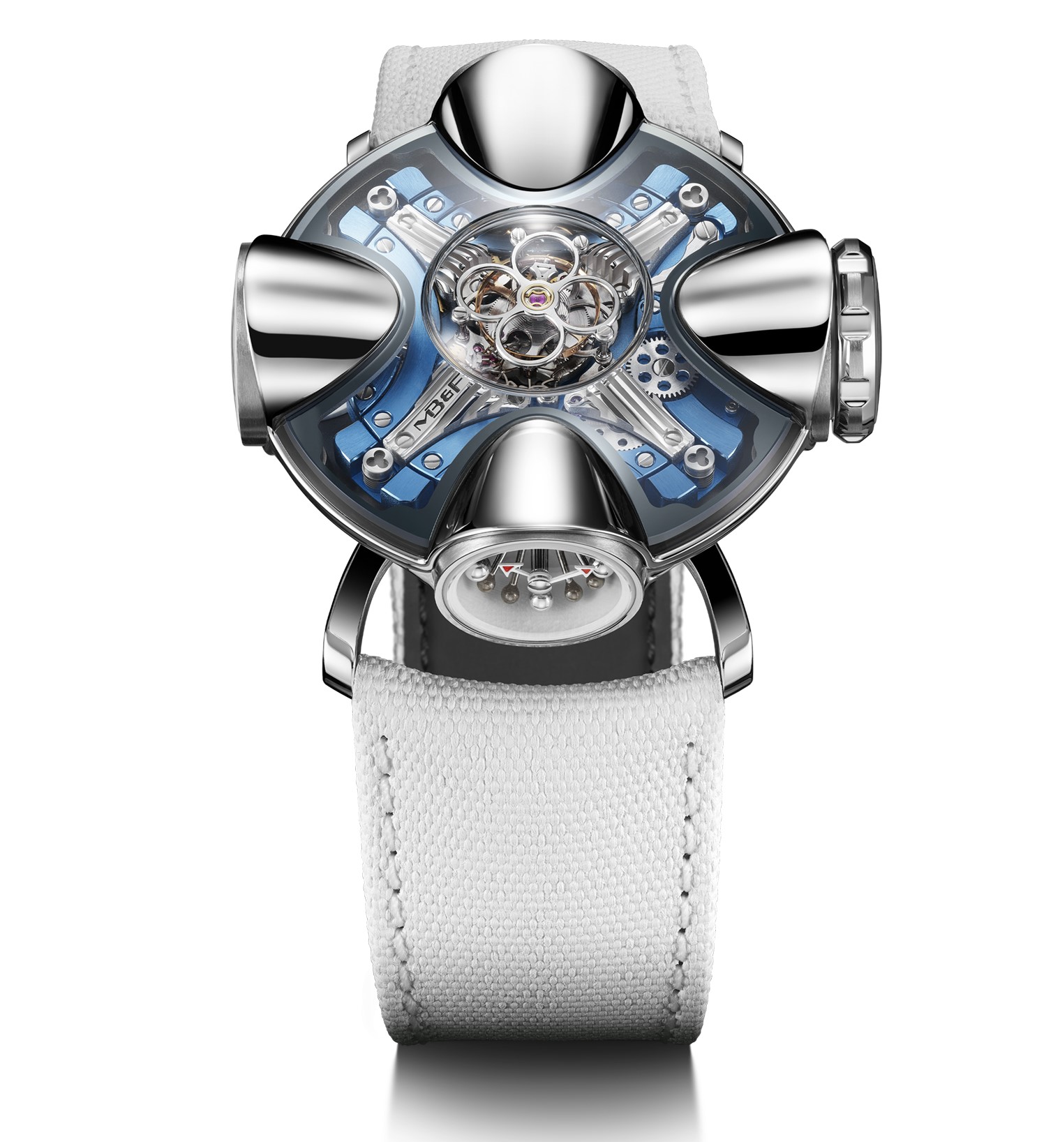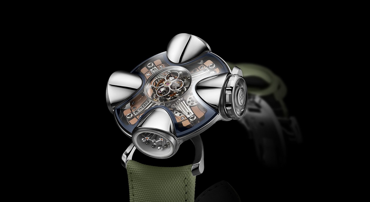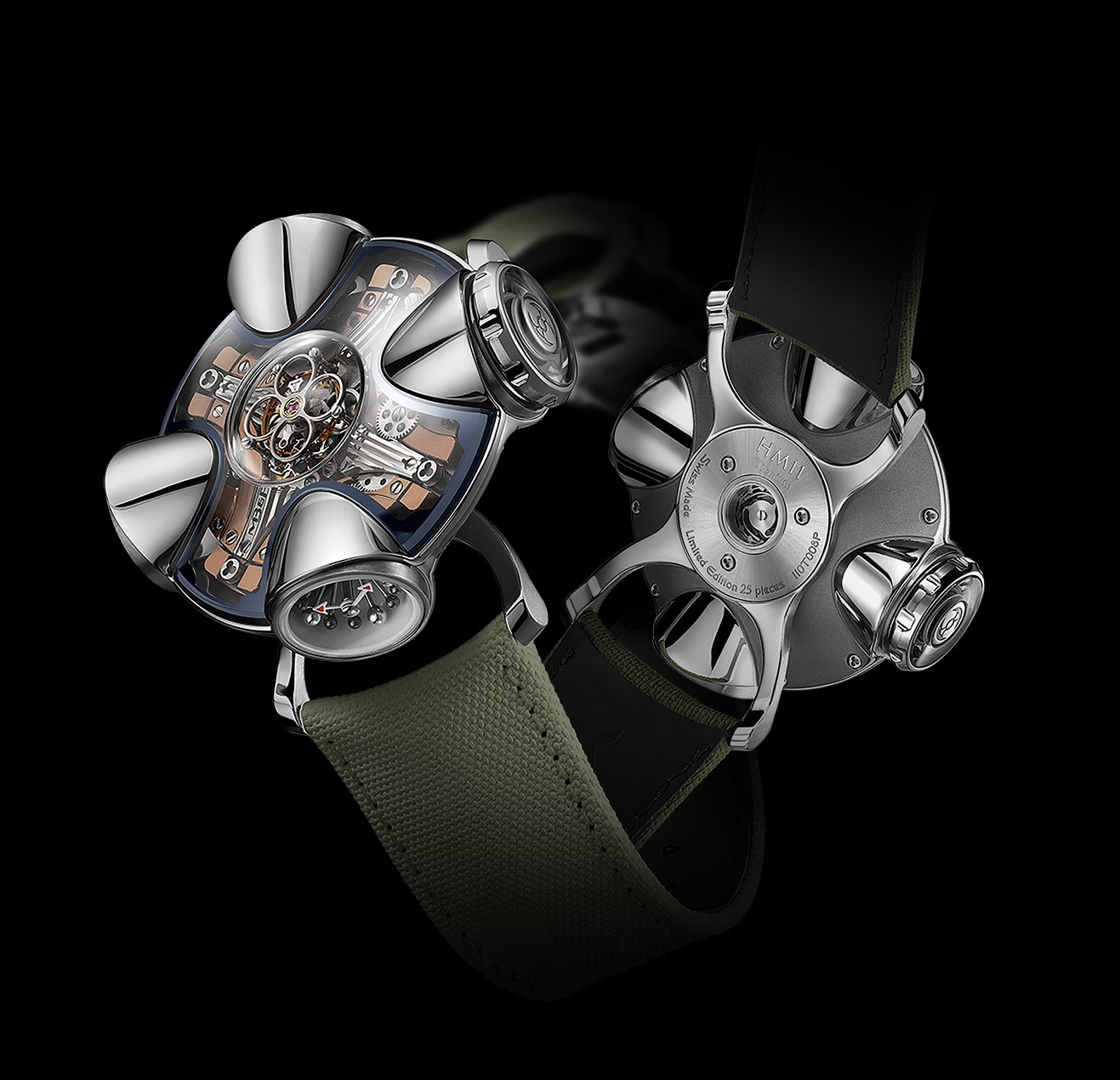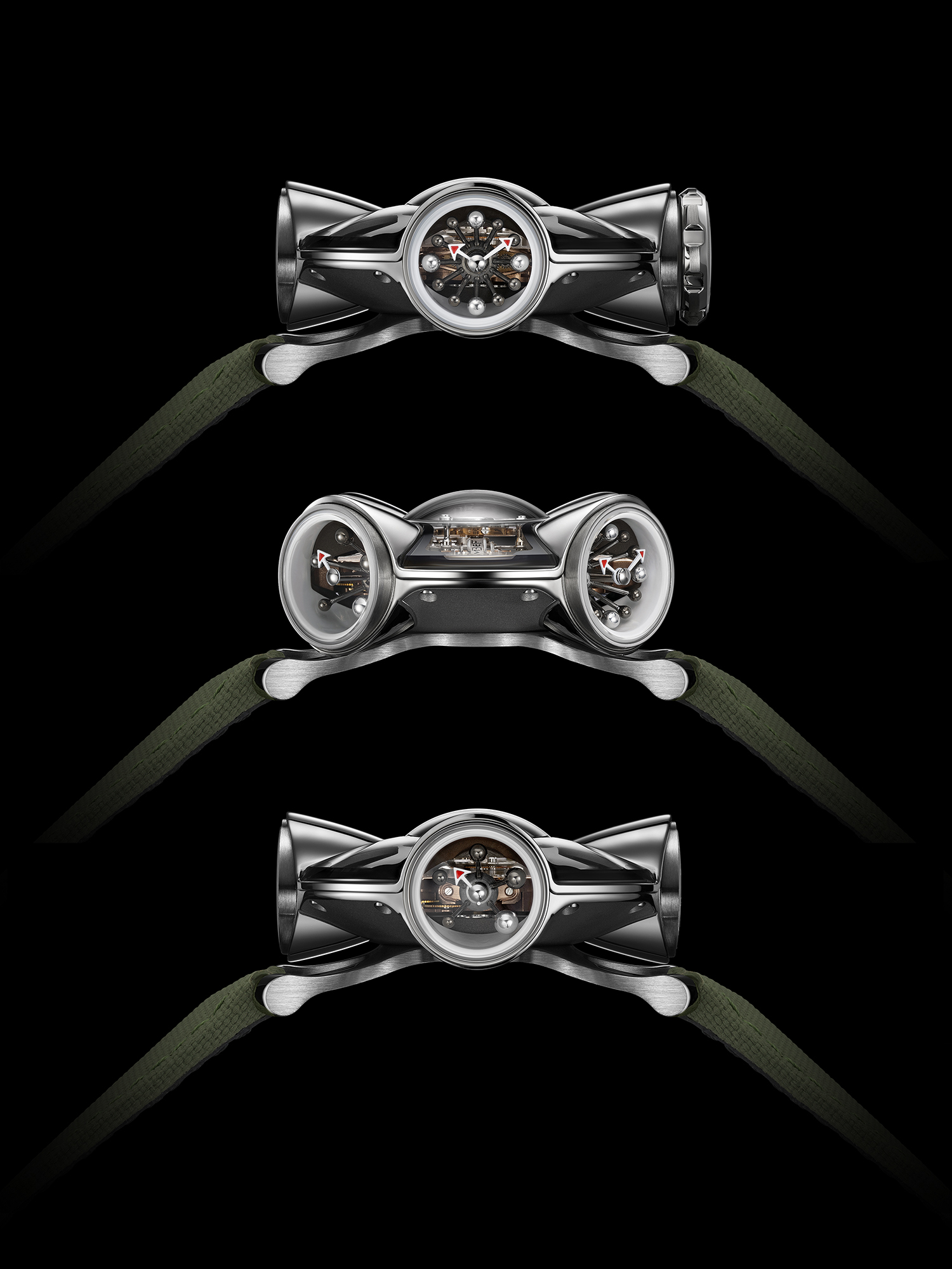 Полный запас хода HM 11 Architect, обеспечиваемый десятью полными оборотами корпуса, составляет 96 часов, а функциональные индикаторы созданы на основе стрелочных указателей и различных по размеру меток-бусин из светлого алюминия или темного титана, зафиксированных при помощи стержневых опор.