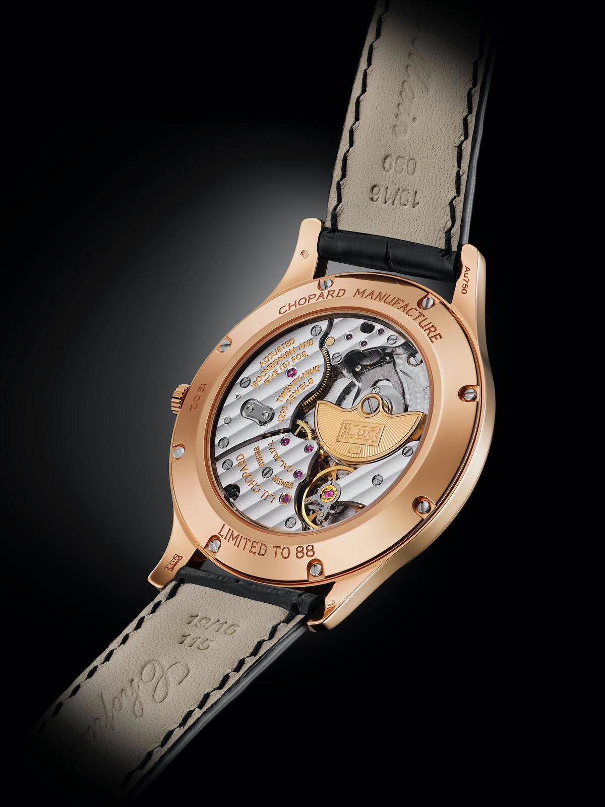 Новинка, основанная на ультратонкой модели L.U.C XP, располагает изящным корпусом, выполненным из «этичного» 18-каратного розового золота и насчитывающим 39.5 мм в диаметре при толщине 6.8 мм и водонепроницаемости WR 30M.