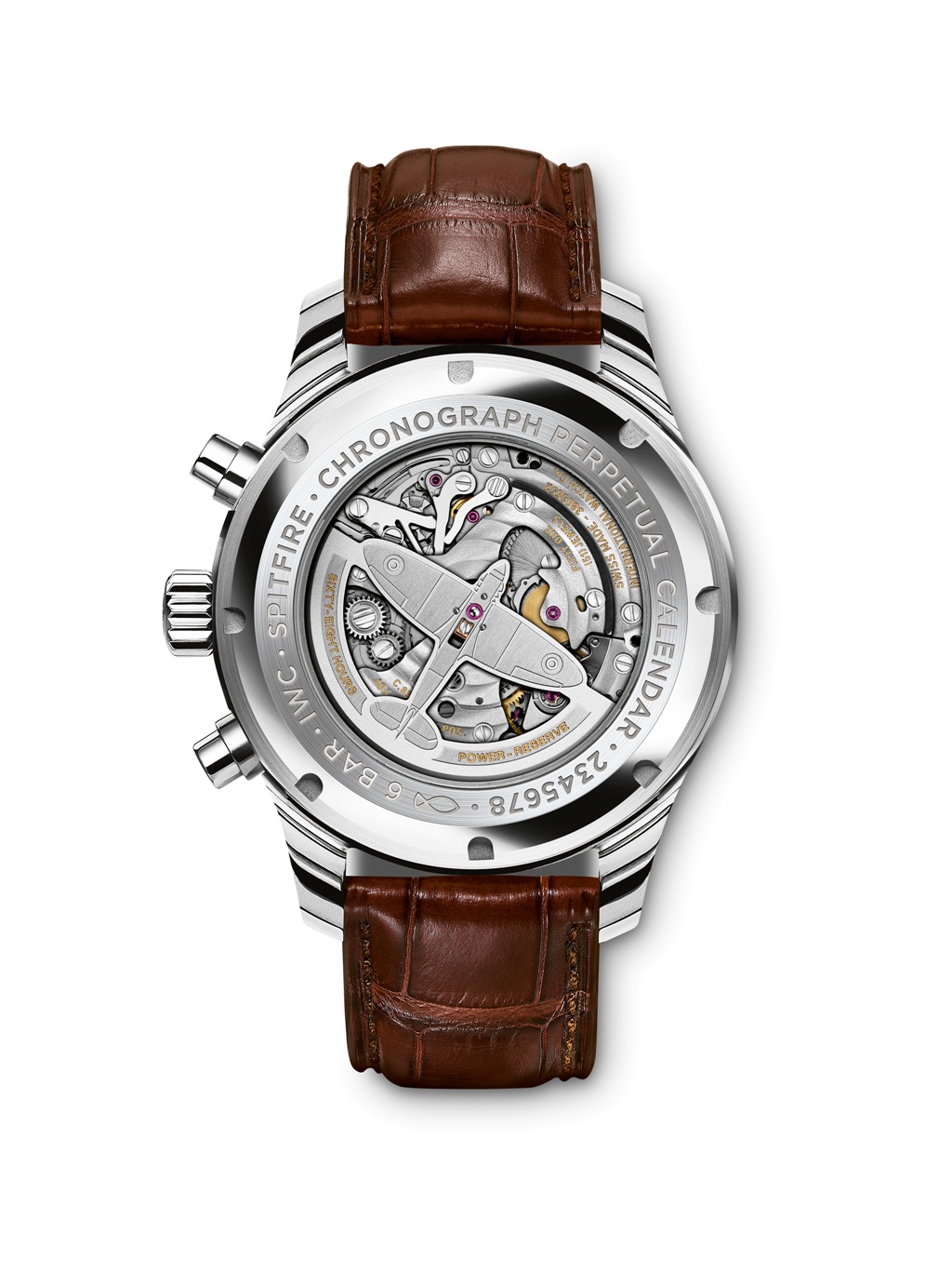 За прозрачным окном задней крышки корпуса можно наблюдать работу ротора автоподзавода, выполненного в форме истребителя Spitfire.