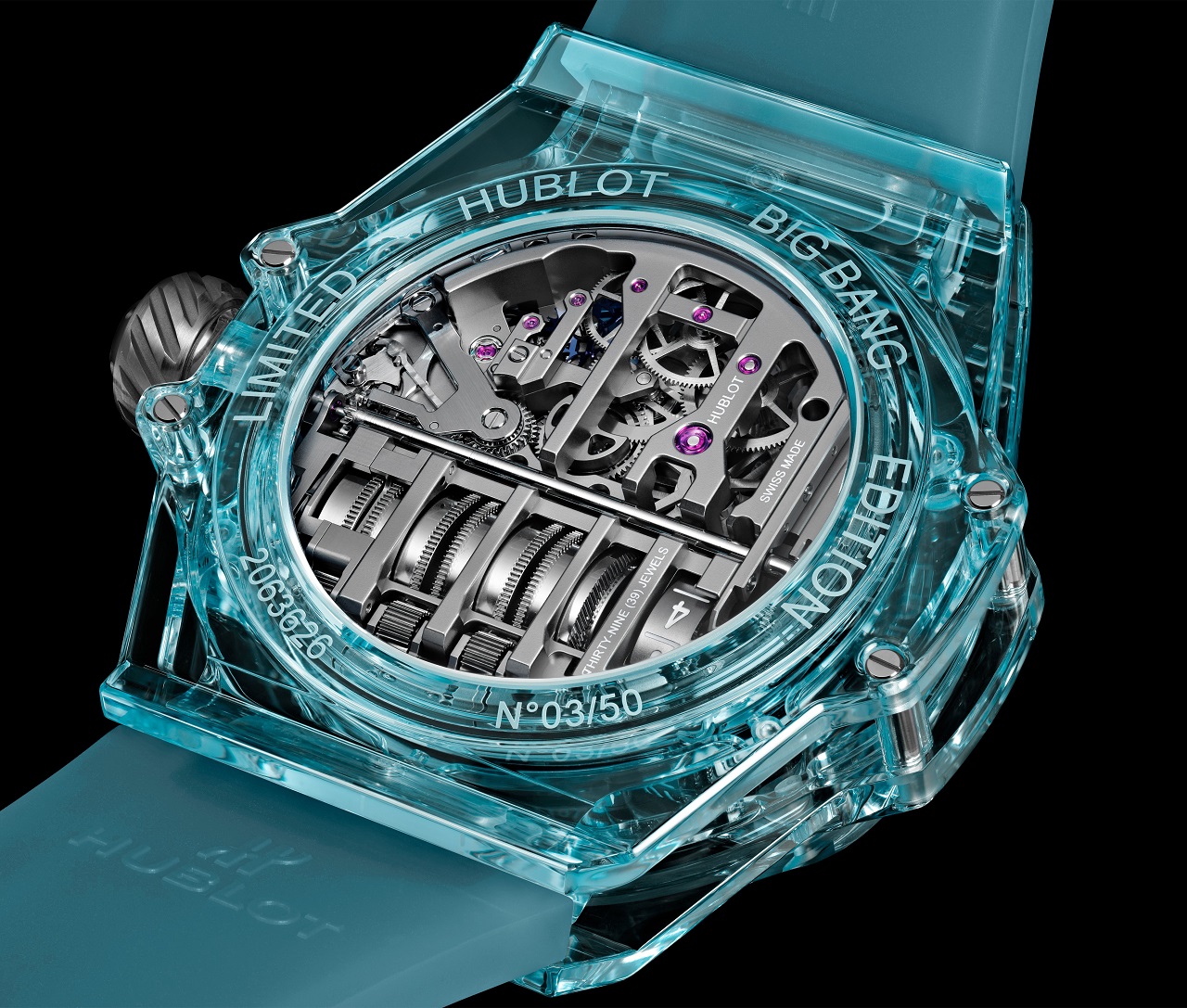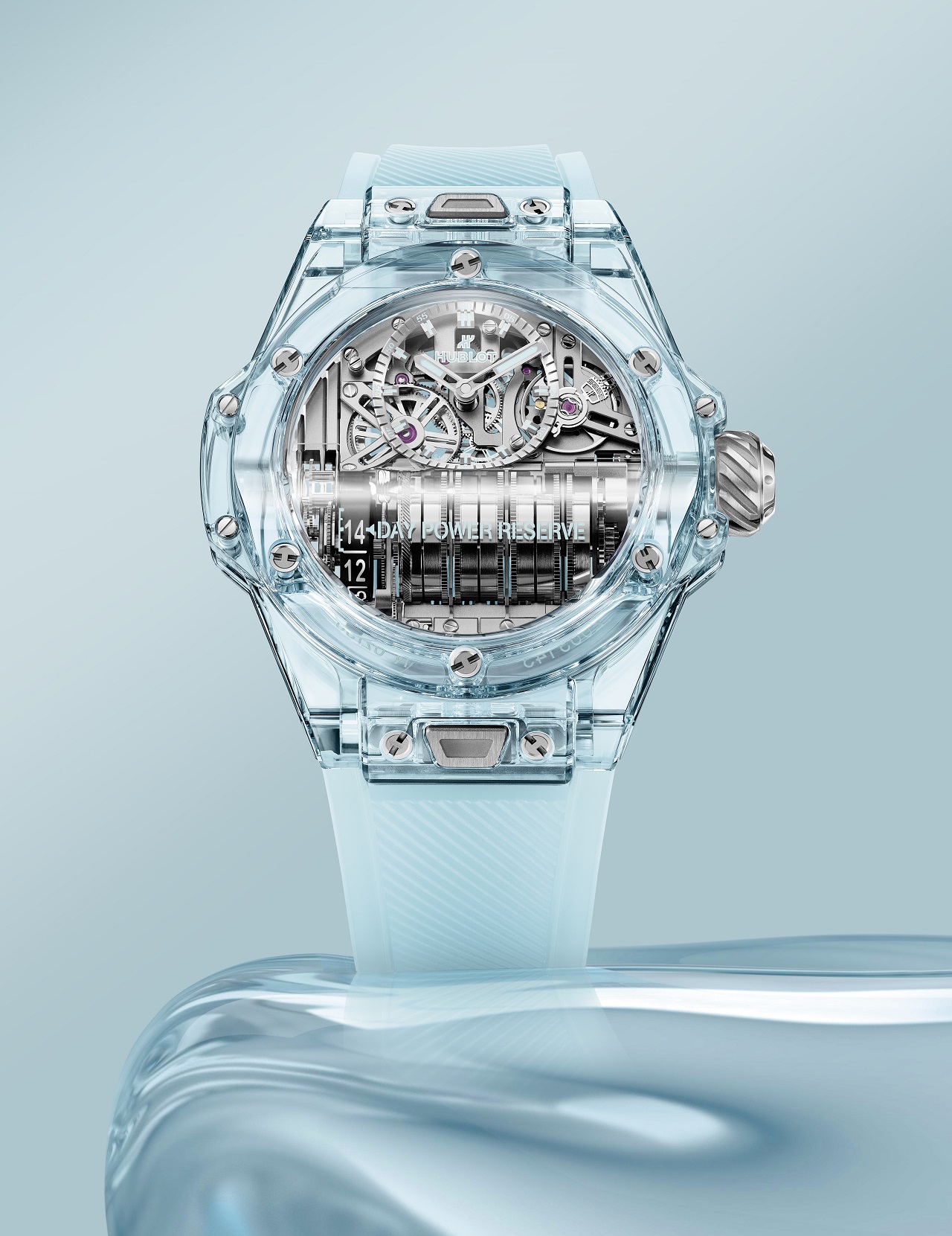Модель укомплектована прозрачным каучуковым ремешком холодного голубого цвета (Water Blue) и титановой раскладывающейся застежкой, а ее эксклюзивный характер подчеркивает ограниченная серия из 50 индивидуально пронумерованных экземпляров.
