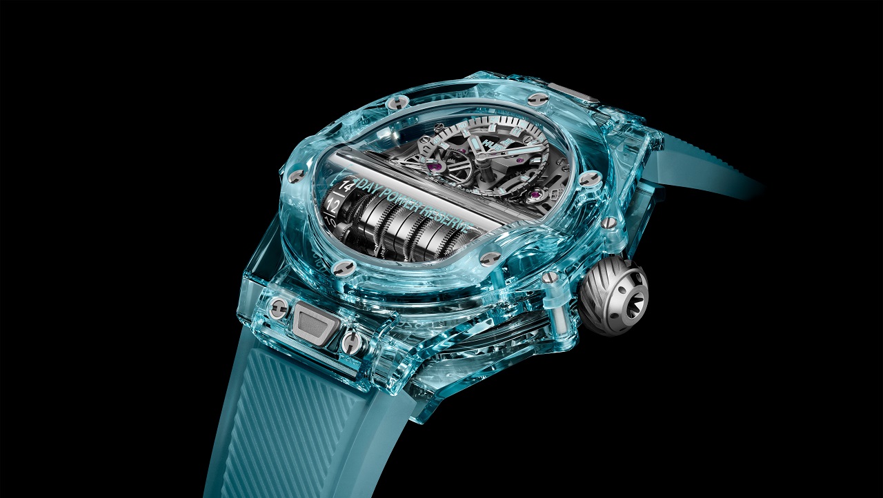 Внутрь сапфировой оболочки помещен калибр HUB9011, что для двухстрелочной индикации текущего времени использует горизонтальную систему из семи последовательно соединенных заводных барабанов, располагающую внушительным запасом хода в 336 часов (или 14 дней).