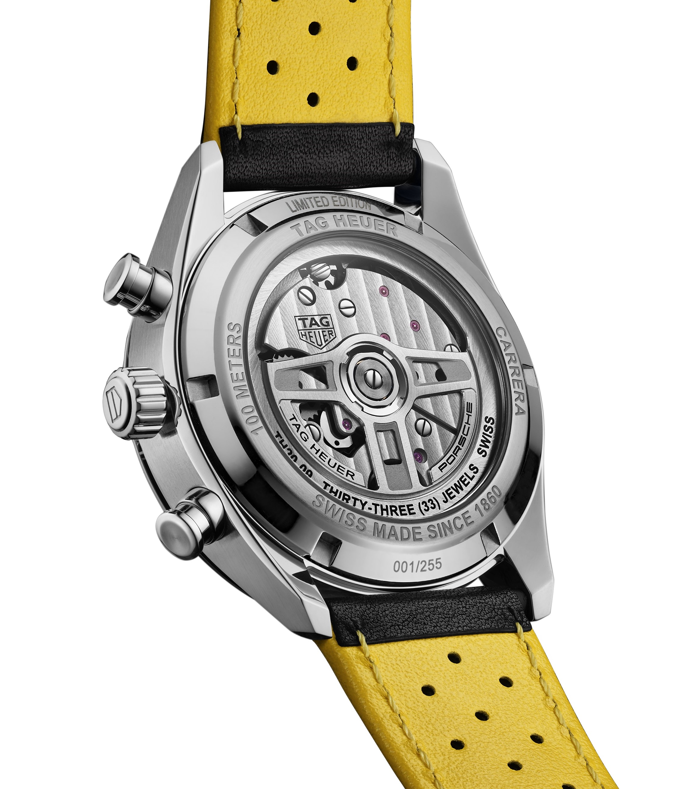В его задачи входит защита циферблата, изящно скелетонизированного в соответствии с дизайном колесных дисков Porsche 550 Spyder и использующего основные цвета его исторической ливреи — серебристый для основного фона, черный для счетчиков-накопителей хронографа и желтый — для лакового покрытия стрелок хронографа.