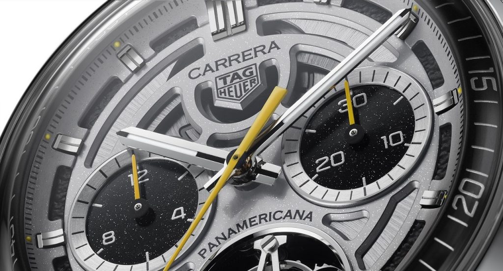 Отметим, что название немецкой автомобильной компании отмечает начало тахиметрической шкалы, надпись Panamericana разместилась над окном минутного турбийона в положении «6 часов», а левая боковина корпуса украшена изящным гравированным шрифтом Spyder.