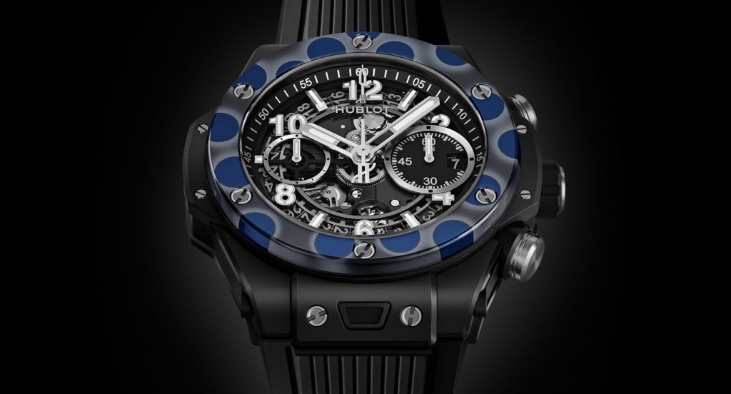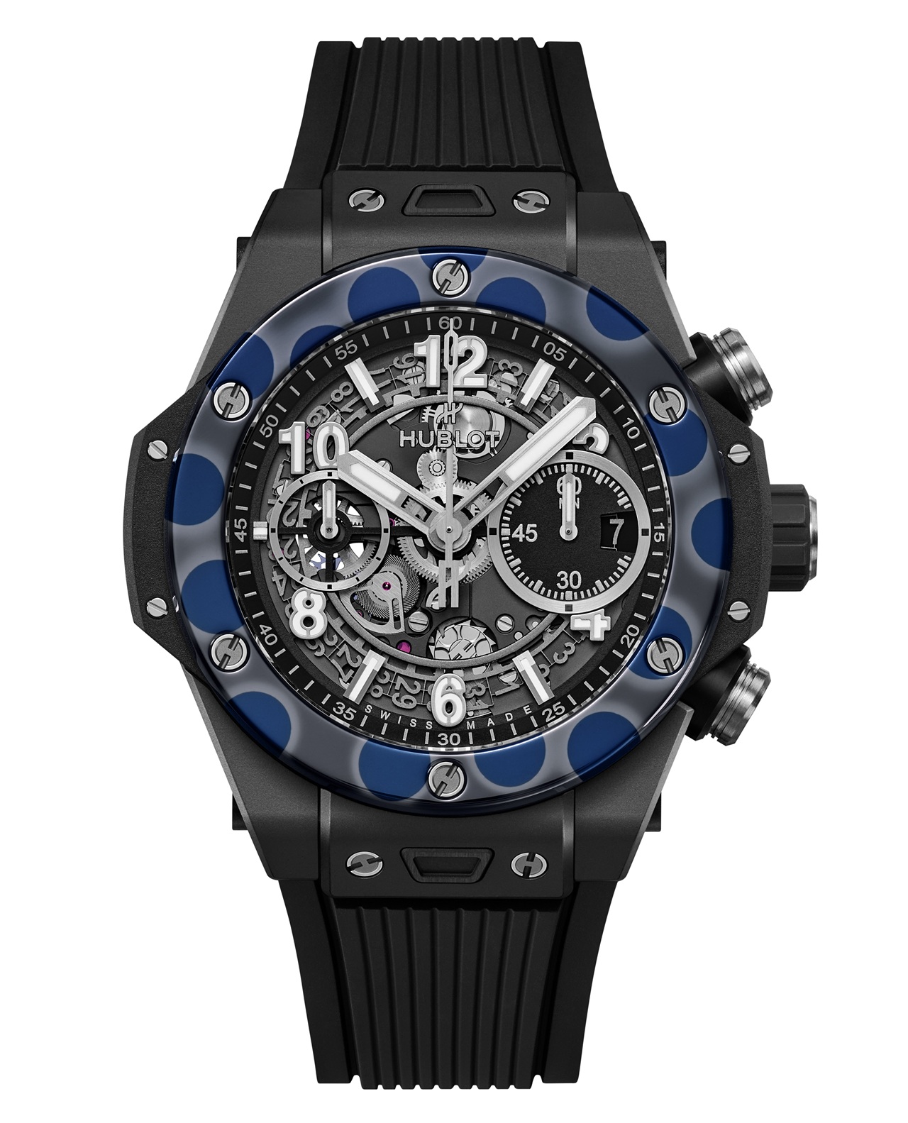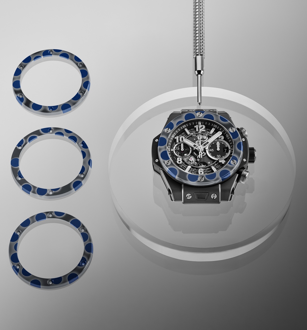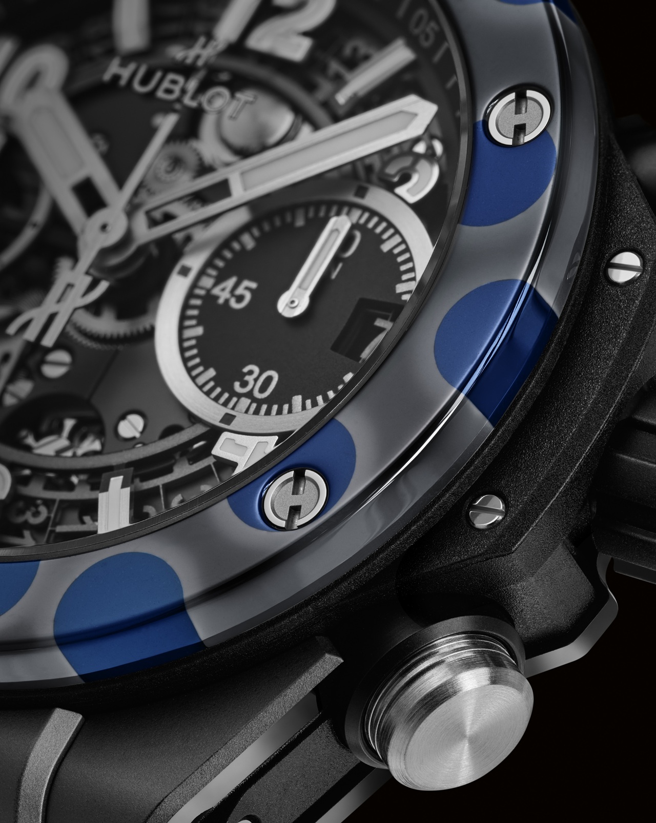 Такой деталью стал полированный безель, градиентный серый цвет которого сочетается с ярко-синими кругами, что входит в состав корпуса Big Bang из черной керамики диаметром 42 мм и толщиной 14.5 мм (WR 100M).