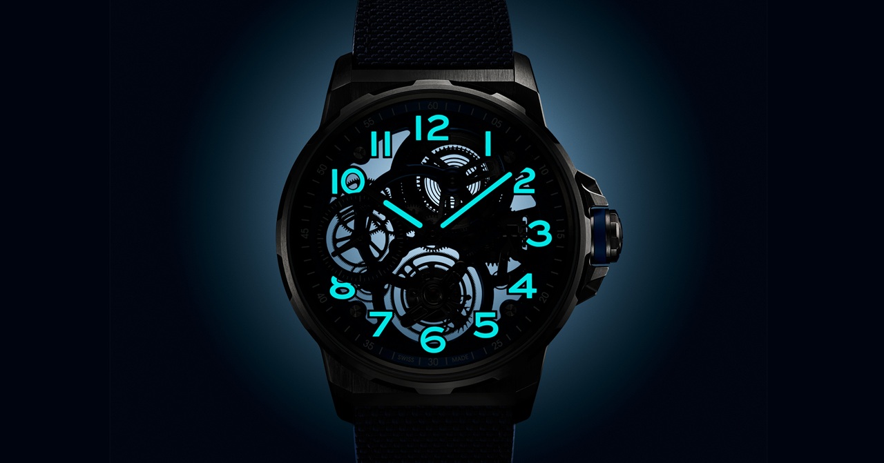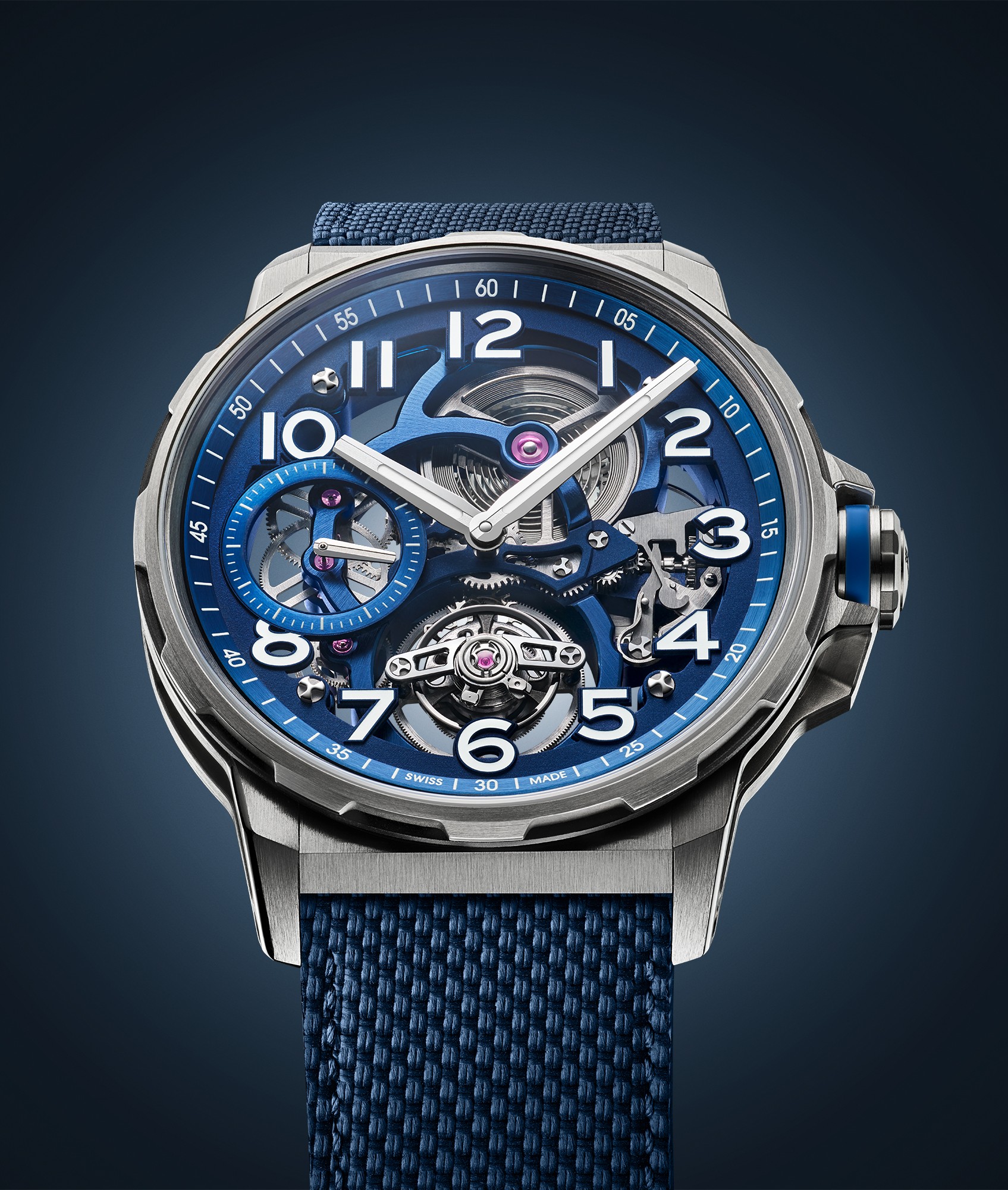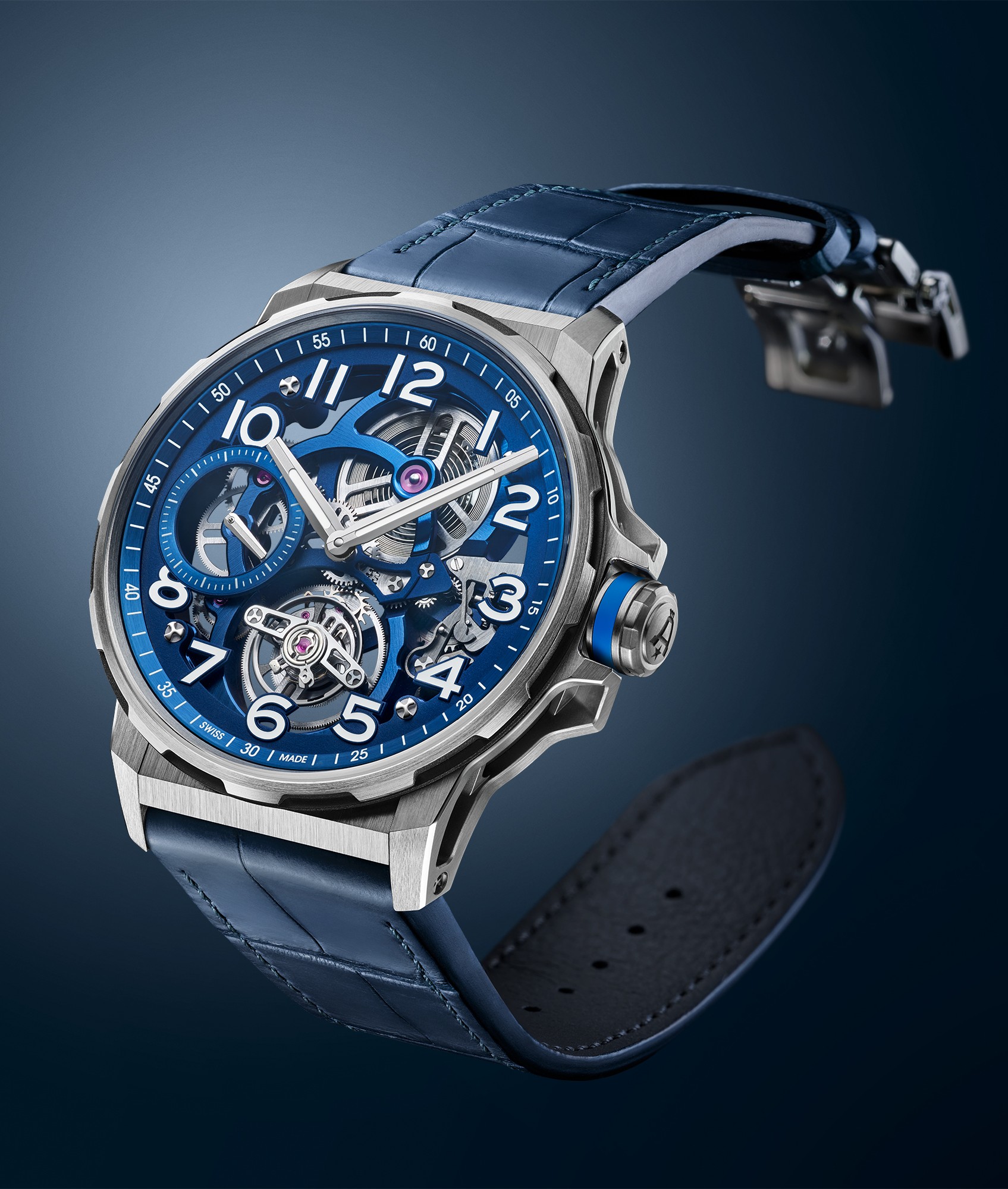 Отметим, что защита механизма обеспечивается специальным карбоновым контейнером, а реализовать единую цветовую концепцию модели помогает синее покрытие мостов и основной платины калибра, созданное методом вакуумного напыления (PVD).