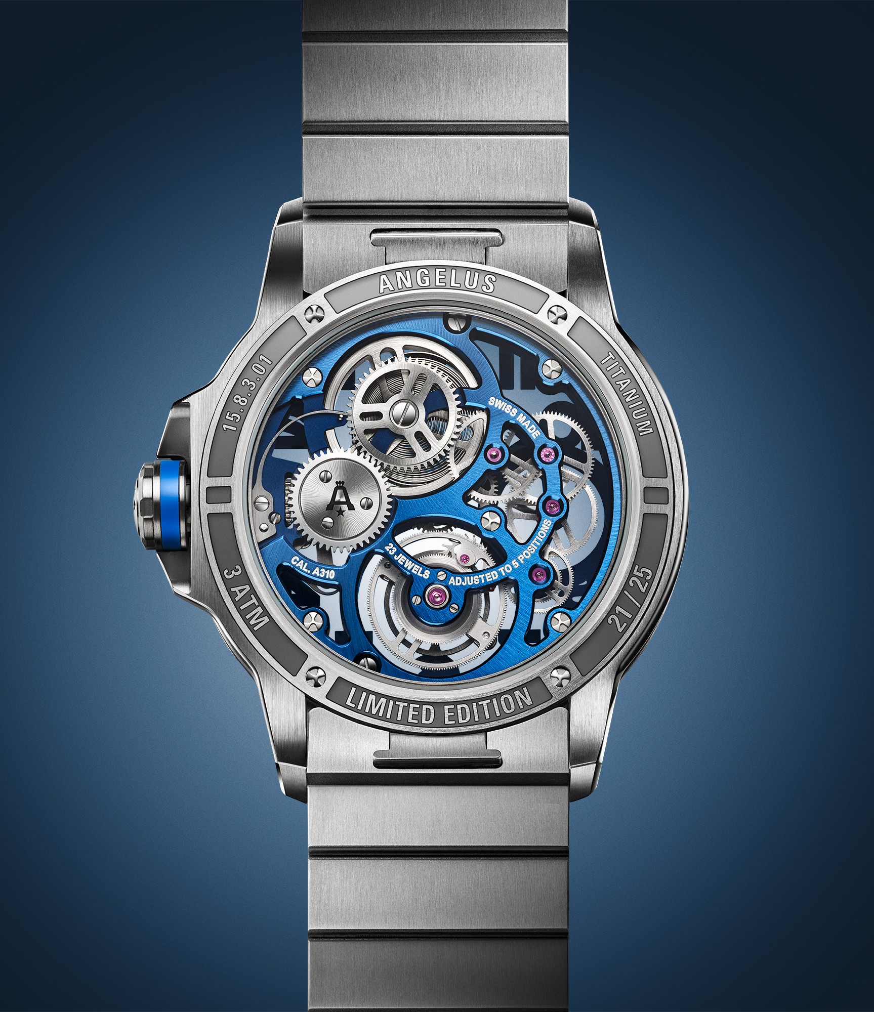 Стены часовой мануфактуры La Joux-Perret в Ла Шо-де-Фон покинут 25 экземпляров ограниченной серии часов Angelus, изюминкой которых является «парящий» турбийон, помещенный в антураж из элементов синего цвета.