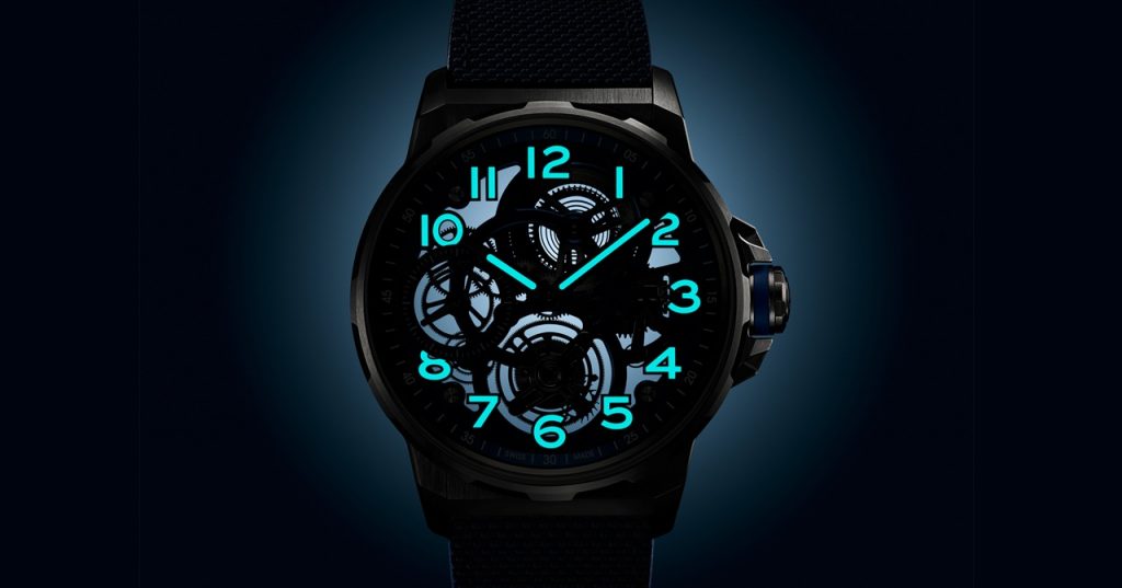 Композиция циферблата собрана вокруг двух центральных и малого секундного указателя (в положении «9 часов»), движущихся на фоне открытого механизма в окружении синего бокового фланца с минутной разметкой и крупных арабских часовых меток синего цвета, заполненных люминесцентным составом с голубой эмиссией.