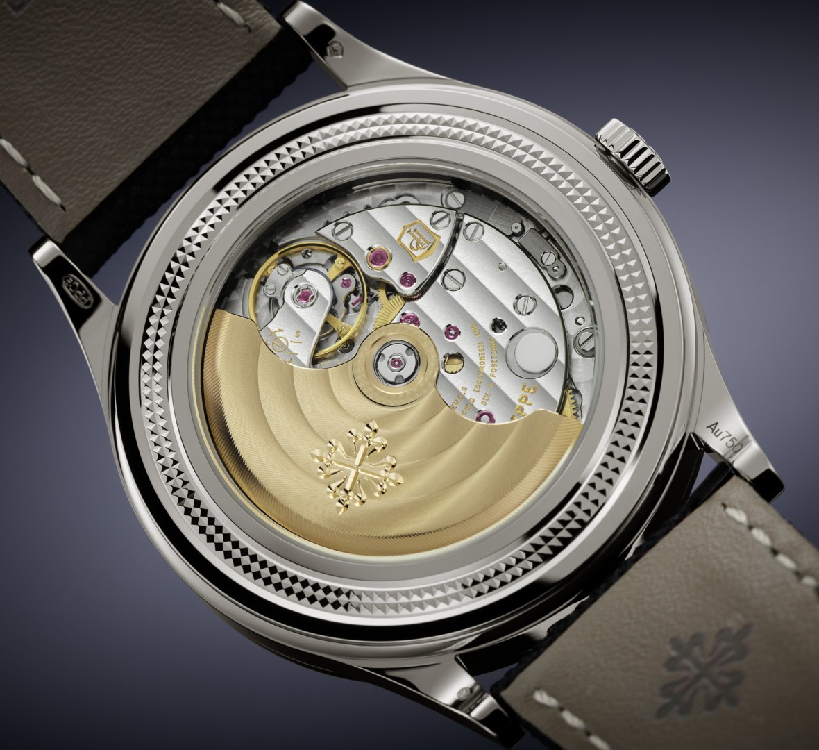 При этом в оснащение механизма входит золотой ротор автоподзавода с крестом Калатравы, а высокий уровень финишной отделки и декорирования подтвержден клеймом качества Patek Philippe, нанесенным на один из мостов калибра.