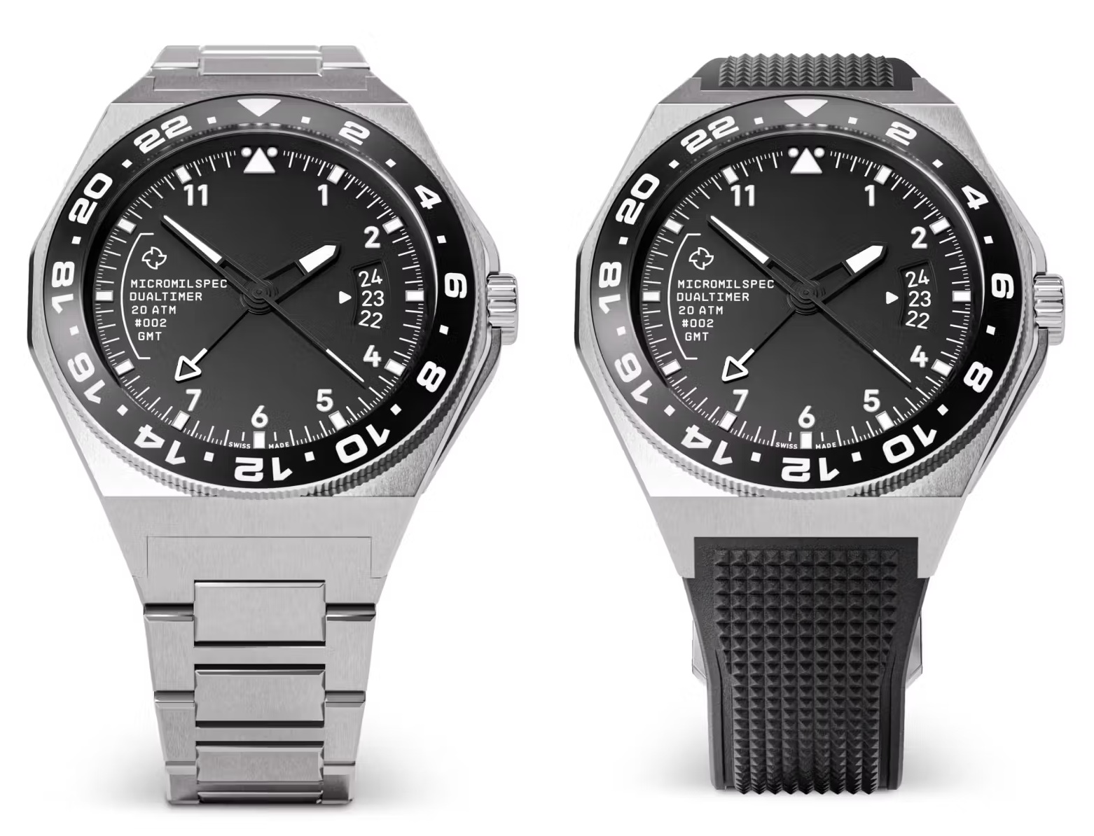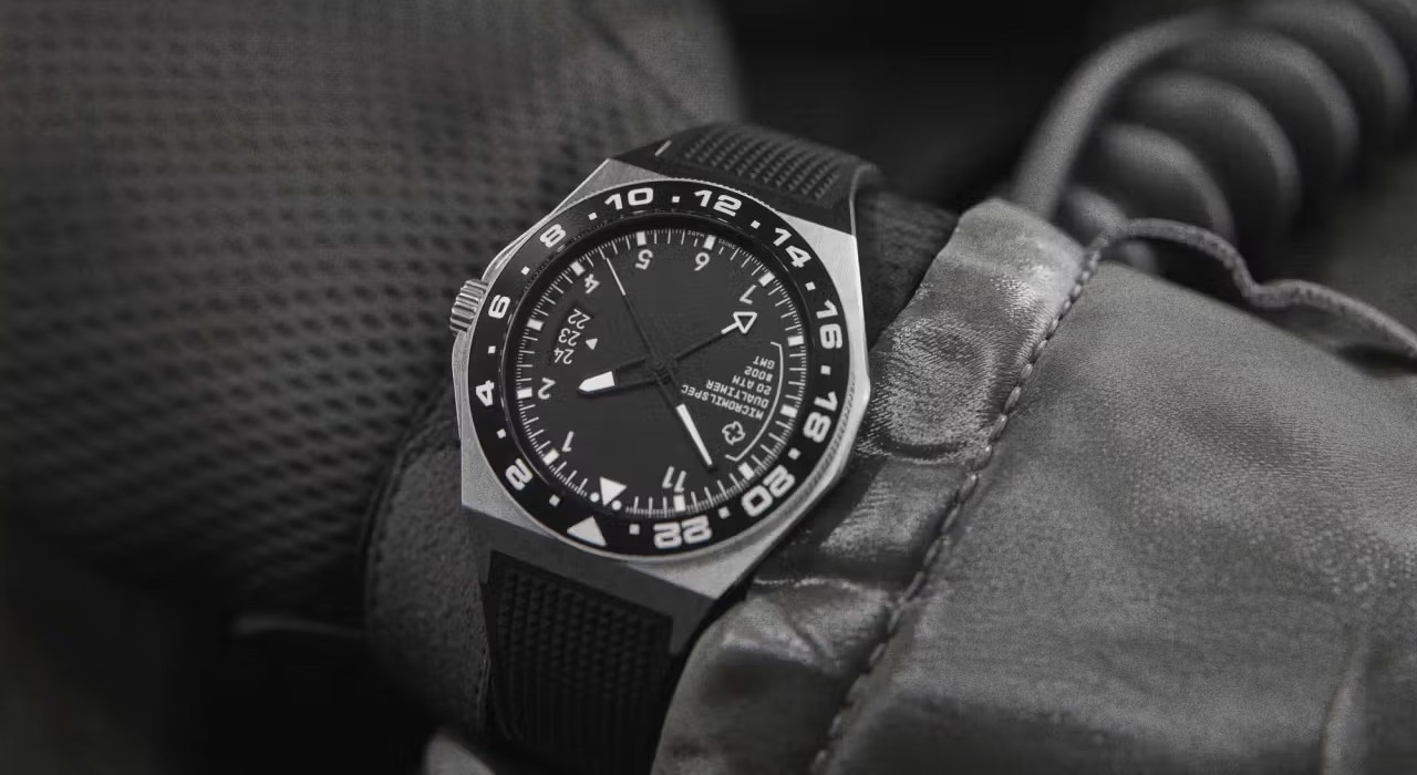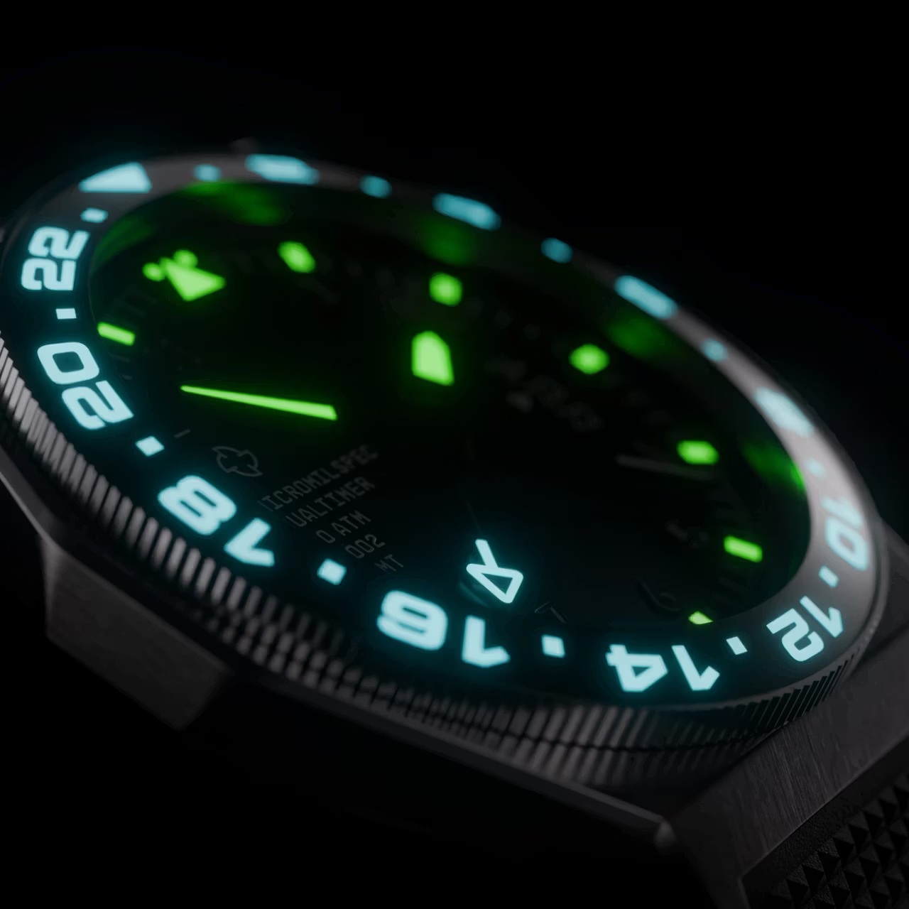 Матовый черный циферблат заключен в кольцо рифленого безеля с 24-часовой шкалой GMT, при этом цвет свечения люминесцентного состава Super-LumiNova X1, нанесенной на элементы индикации, определяет ее принадлежность к одному из двух часовых поясов: зеленый отвечает за локальное время, а голубой — за домашнее.