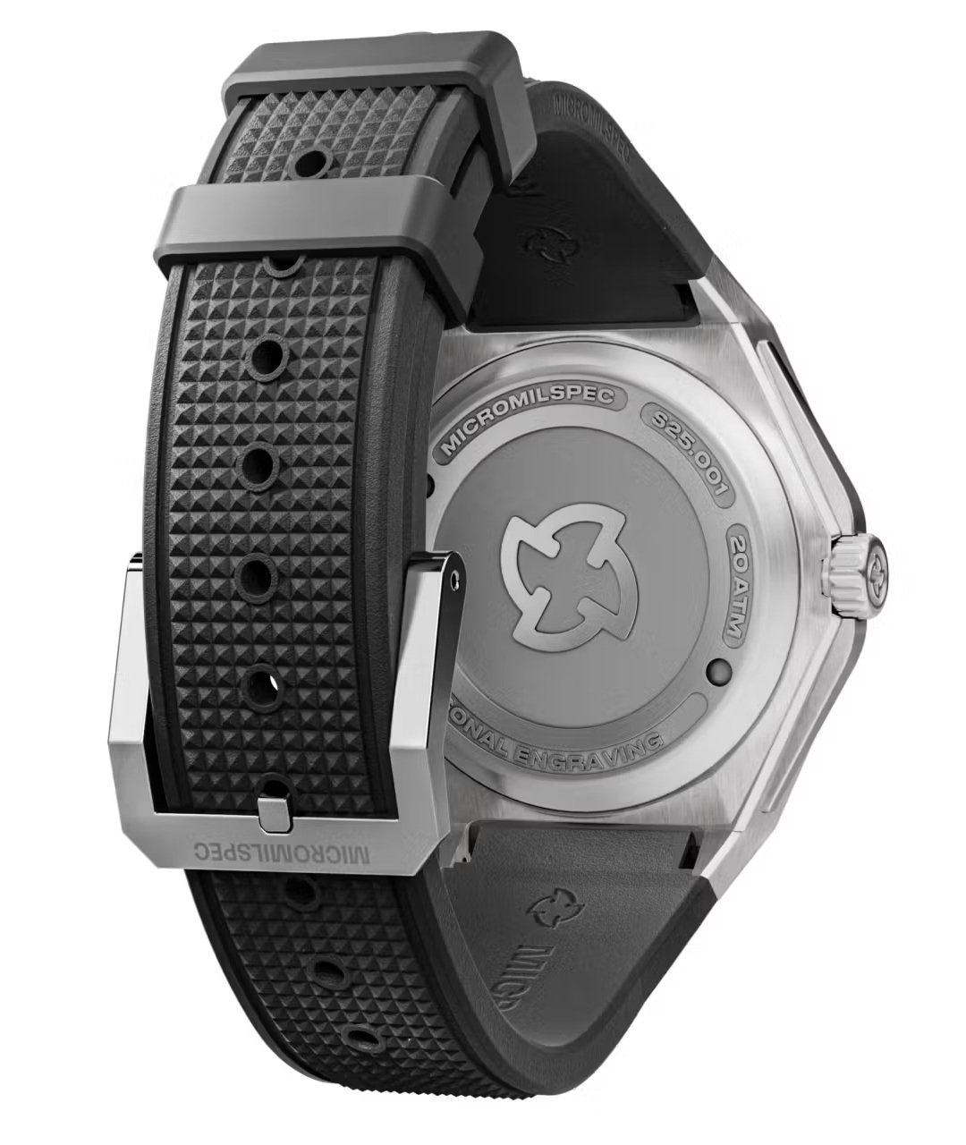 Изделие может быть укомплектовано интегральным стальным браслетом с двойной раскладывающейся застежкой, либо идти в составе с рифленым каучуковым ремнем черного, белого или оранжевого цветов в связке с классической стальной застежкой.