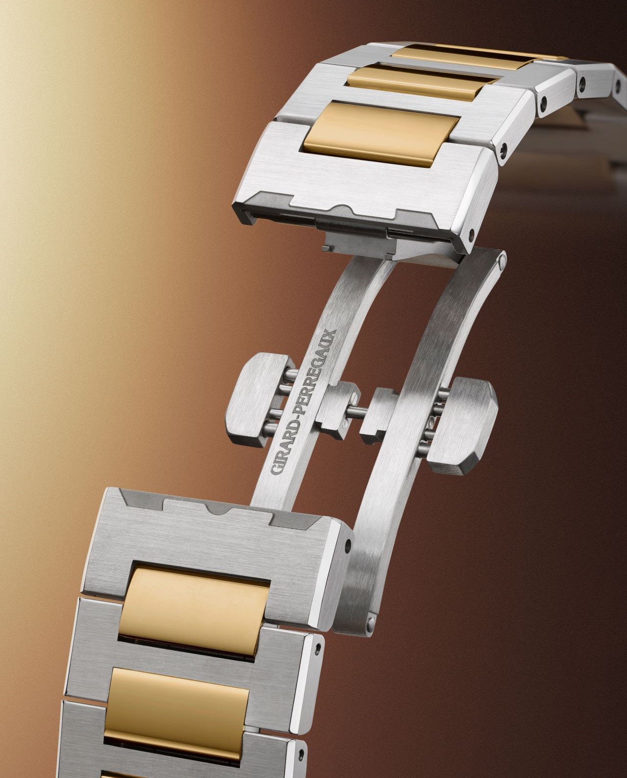 Отдельного внимания заслуживает интегральный браслет, стальные Н-образные звенья которого утончаются по мере приближения к застежке, а интерлинки из желтого золота привлекают более округлой формой для демонстрации объема и игры света.