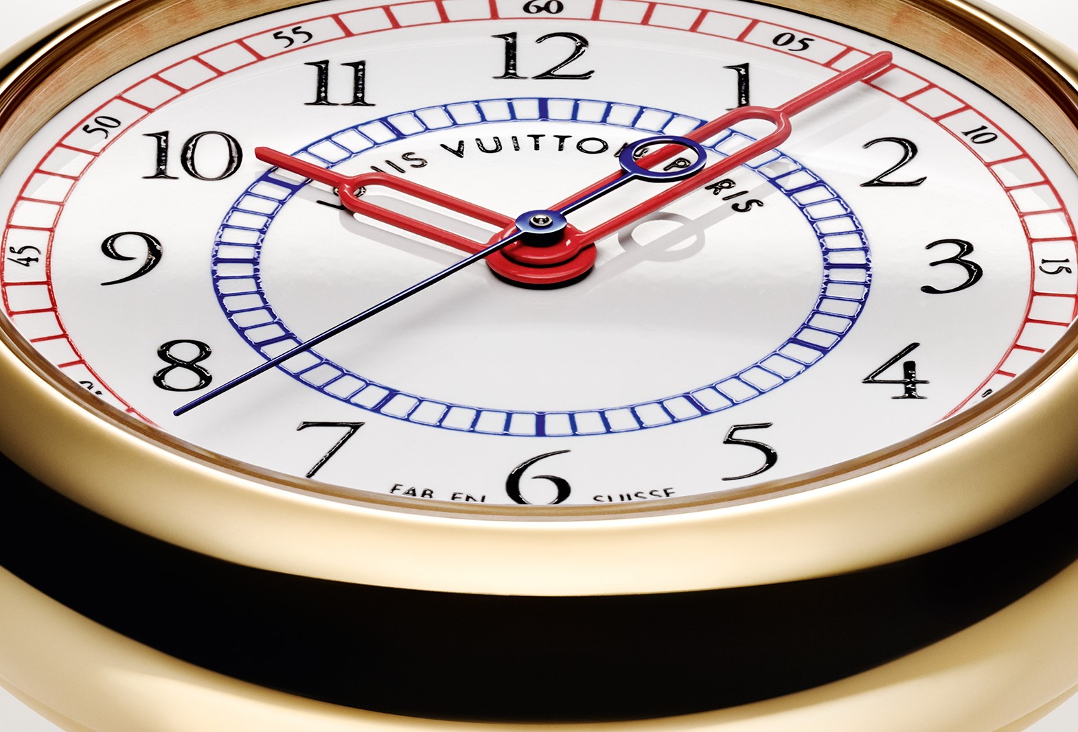 Отображение времени происходит при помощи трех центральных указателей из лакированного в красный цвет золота (часы-минуты) и вороненой стали (секунды), движущихся на фоне эмалевого циферблата, созданного в технике Гран Фе, с трехцветной разметкой на основе эмалевых паст, переносимых и обжигаемых по очереди.
