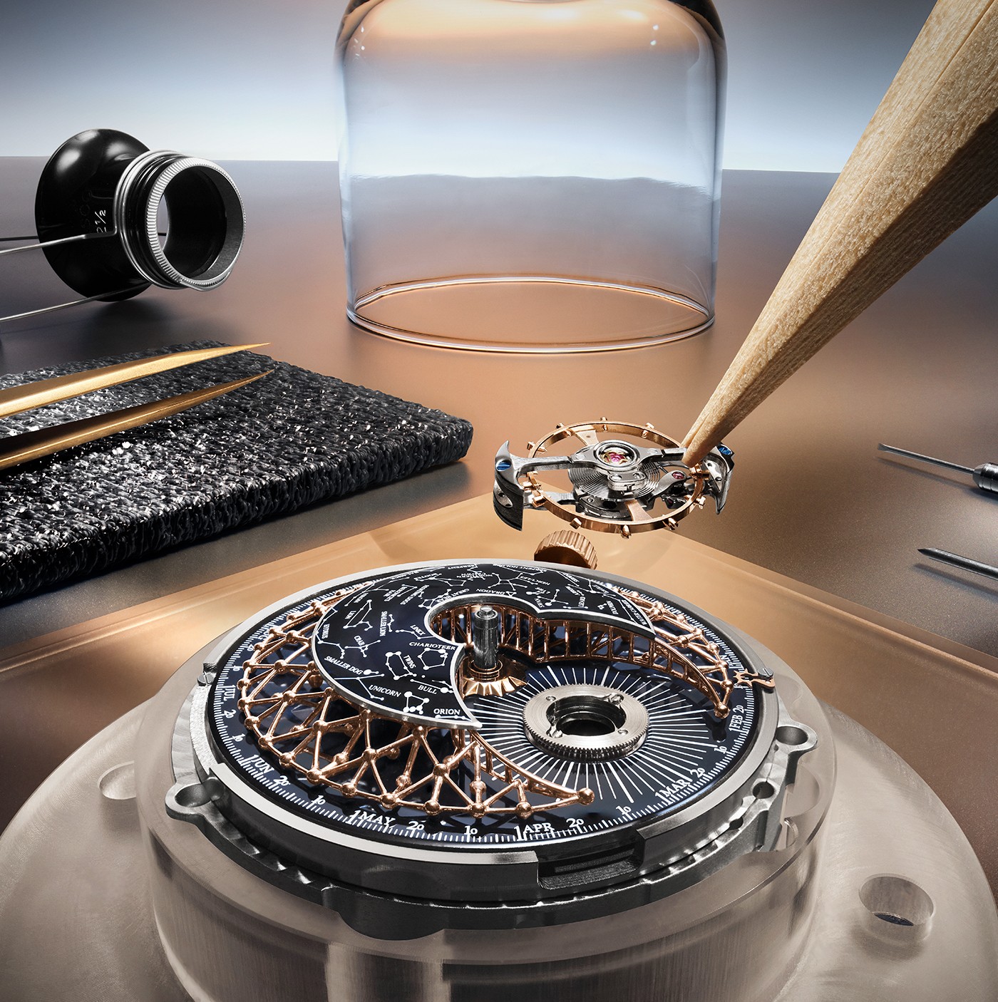 Вектор развития, заданный для модели Master Grande Tradition Grande Complication пять лет назад, продолжается в новой, ограниченной 5 экземплярами, серии, где фирменный Космотурбийон сочетается с картой звездного неба в окружении ремесленного искусства, создаваемого в мануфактурном Ателье редких ремесел (Métiers Rares™).