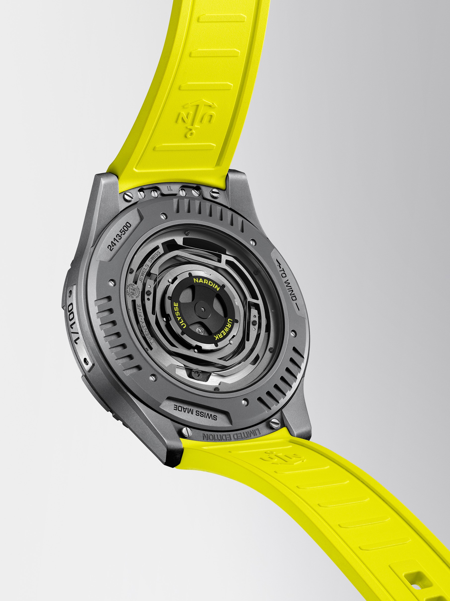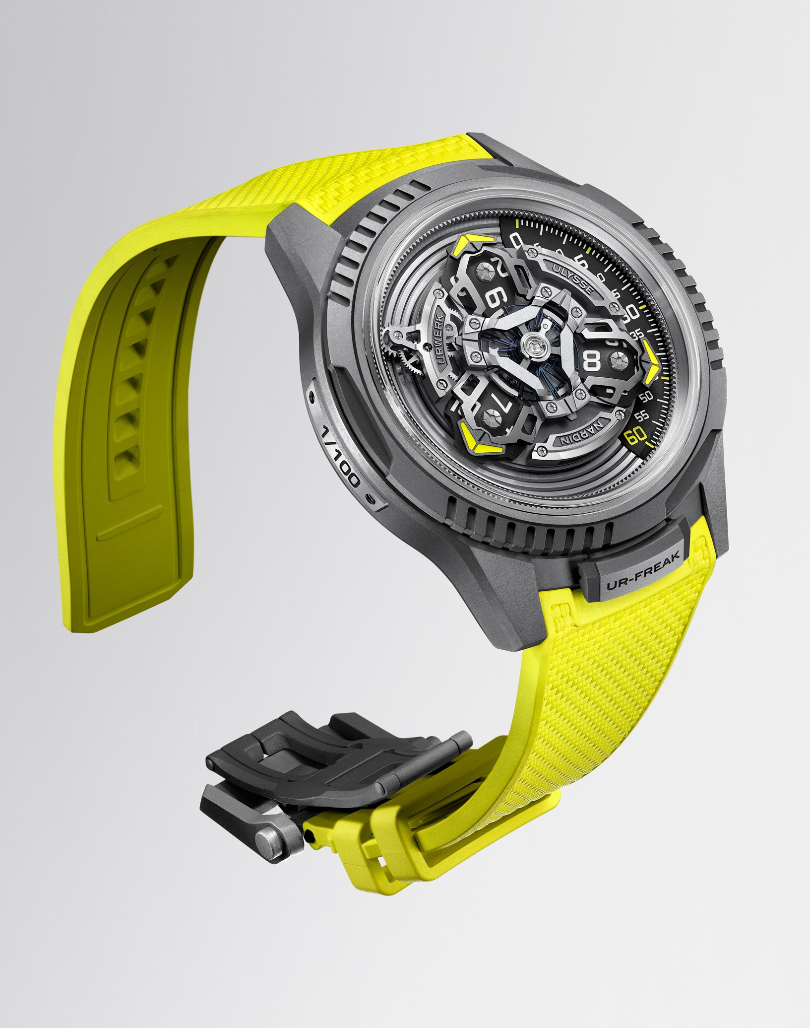 Изделие доступно в паре с титановой раскладывающейся застежкой и текстурированным каучуковым ремешком оттенка Pantone 395 C (электрический желтый), что наряду с рядом элементов оформления циферблата проводит параллель с эмблематическим цветом Urwerk.