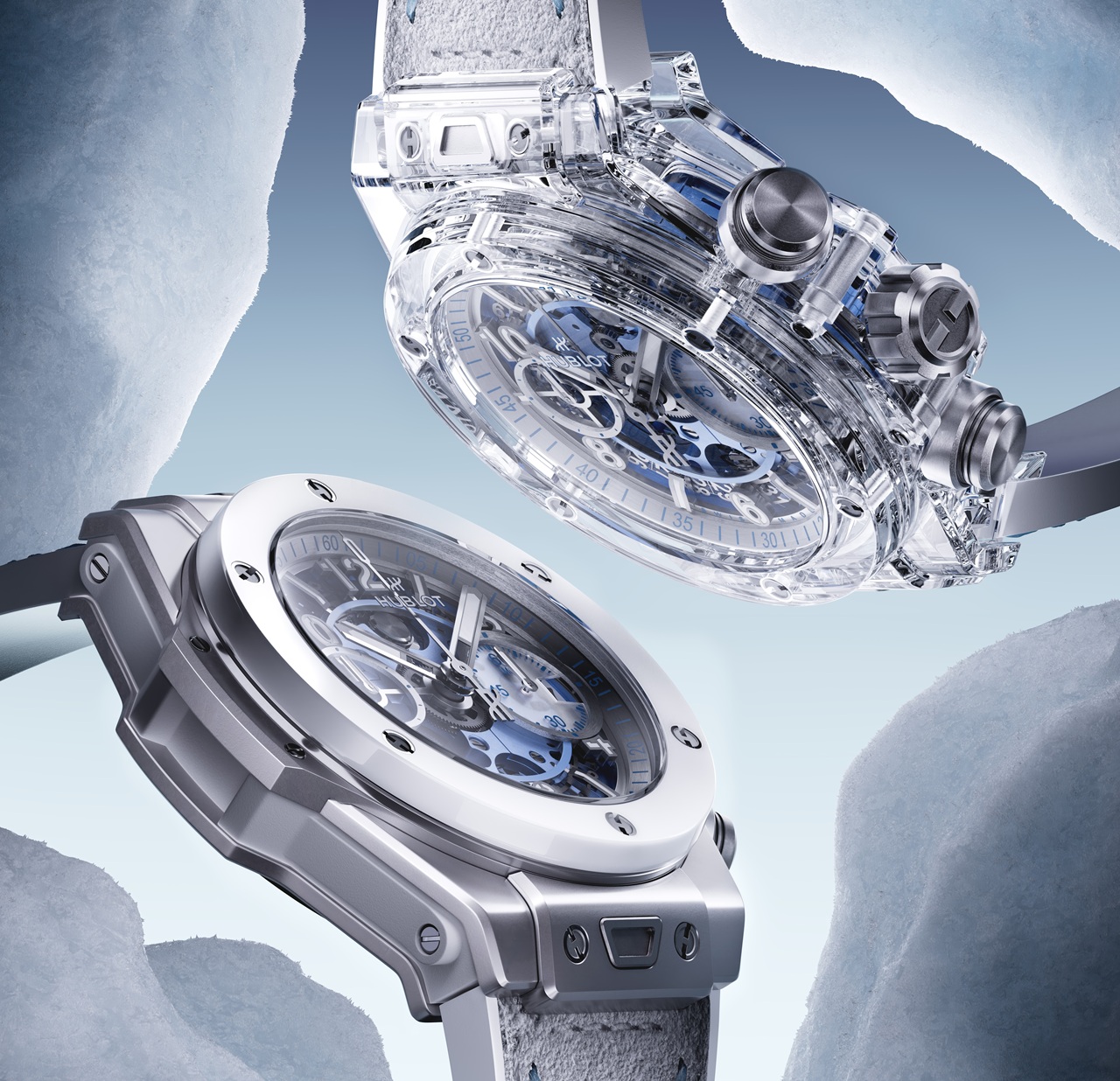 Открытые циферблаты обеих версий используют серебристое оформление в сочетании с акцентами голубого цвета, что затронули элементы разметки и покрытие ряда деталей автоматического калибра HUB1280 с 4-герцовым балансом и запасом хода в 72 часа, примечательного также ротором автоподзавода, стилизованным под снежинку.