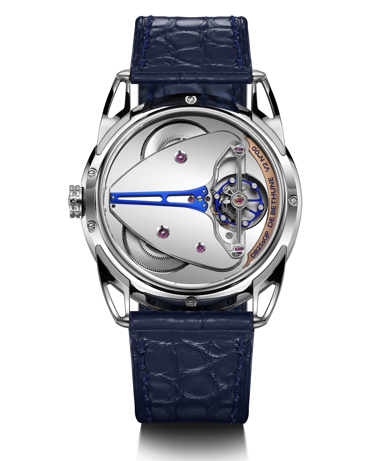 Оборотная сторона модели предлагает не менее роскошный вид на мануфактурный калибр DB2005V3 с ручным заводом, сердцем которого является 4-герцовая колебательная колебательная система с кремниевым анкерным колесом, запатентованной балансовой спиралью и собственно балансом из вороненого титана и периферийных золотых шайб.