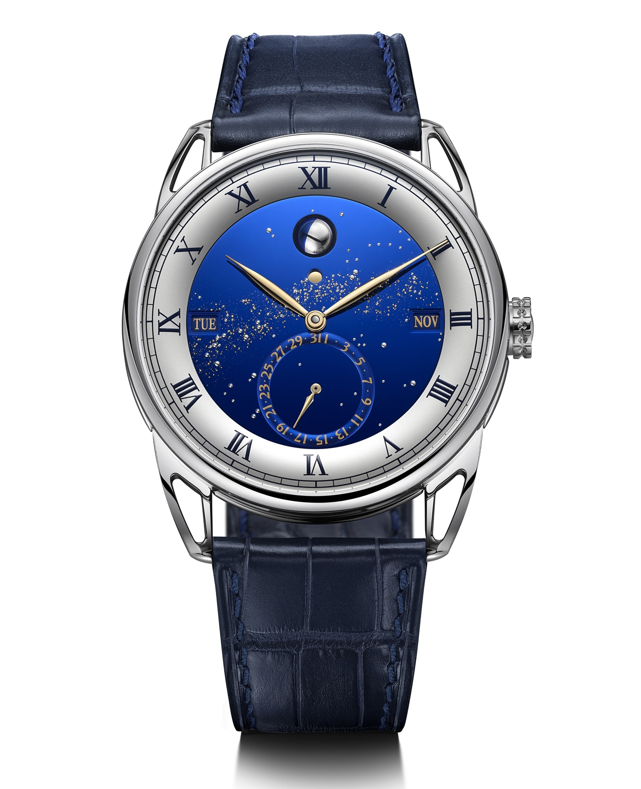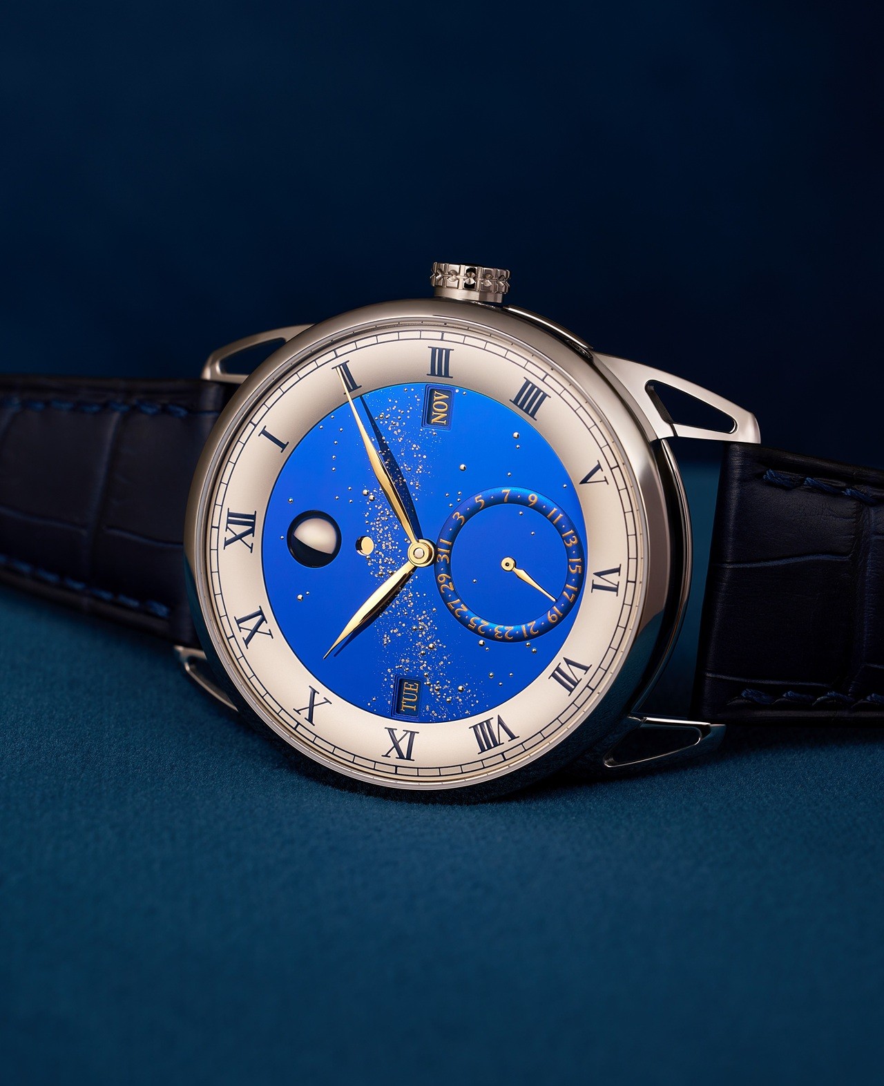 Находящийся в обрамлении серебристого фланца с римской часовой разметкой полированный титановый циферблат, вороненый до насыщенного синего цвета, предлагает композицию из золотых полусфер (starry sky), разбросанных по Млечному пути, изображение которого сформировано при помощи лазерной микро-гравировки и золотистых чешуек.