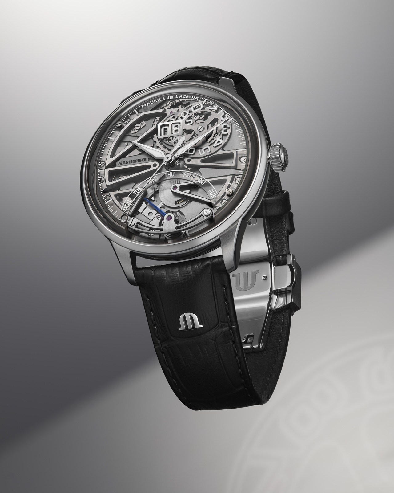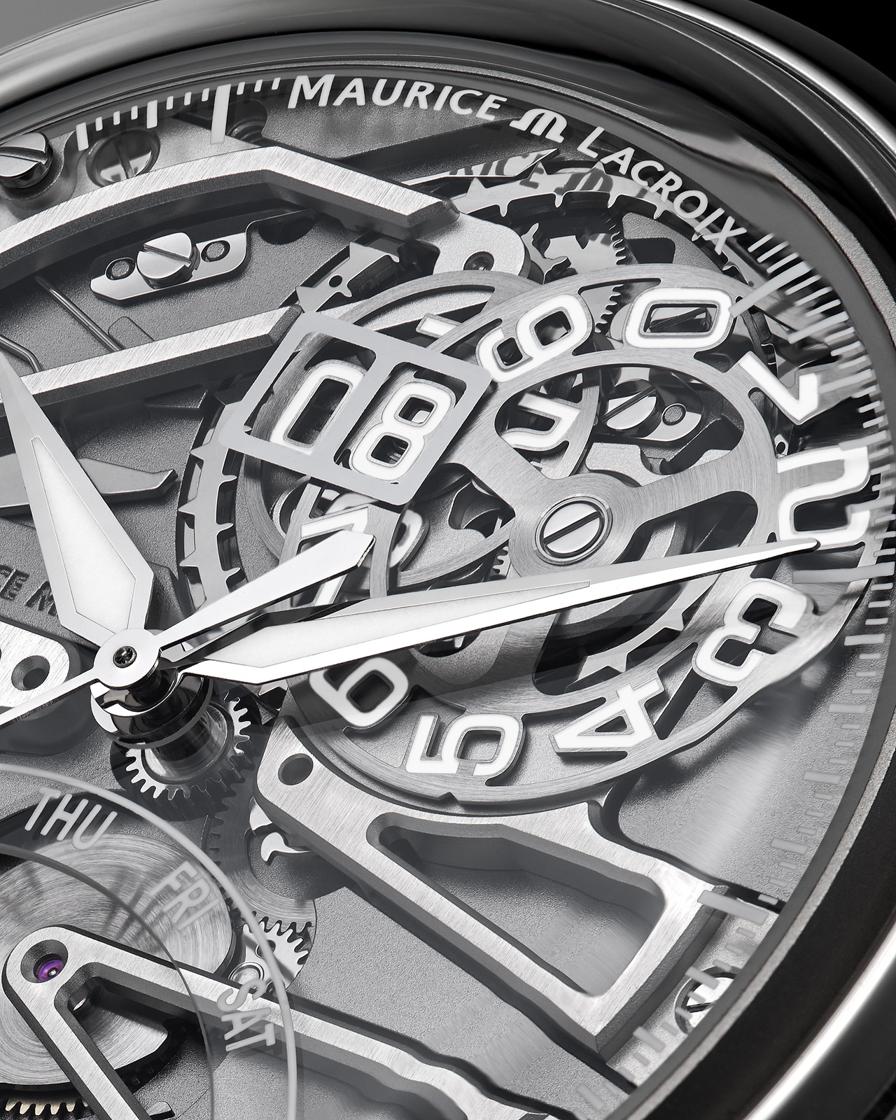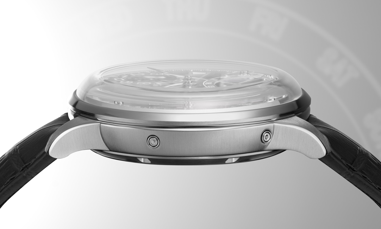 Основой циферблата выступает сапфировое стекло с напечатанной белой разметкой, нижняя часть которого содержит полукруглый вырез для наилучшей демонстрации ретроградного индикатора дня недели, объединенного в единый, изящно скелетонизированный подциферблатный модуль с устройством «большой даты», два диска которой сгруппированы в положении «12 часов».
