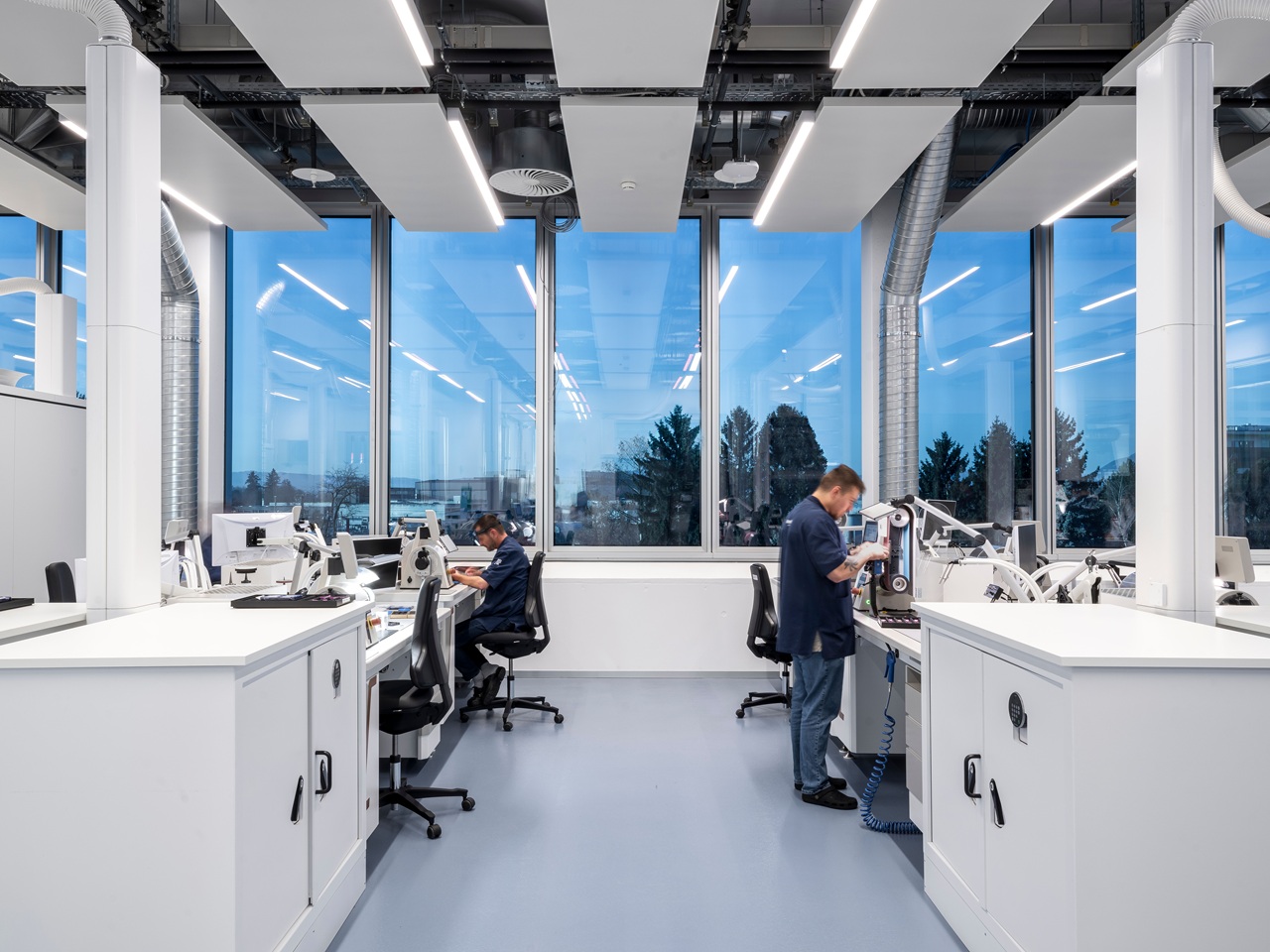 Производственный комплекс общей площадью более 9’000 кв. метров, спроектированный для развития коммуникации, творческой синергии и инноваций, включает в себя открытые пространства и многочисленные зоны, предназначенные для обмена опытом для 350 сотрудников — рабочие места, тихие зоны для сосредоточенной работы, переговорные комнаты и традиционные офисы, позволяющие каждому выбрать наиболее подходящее место.