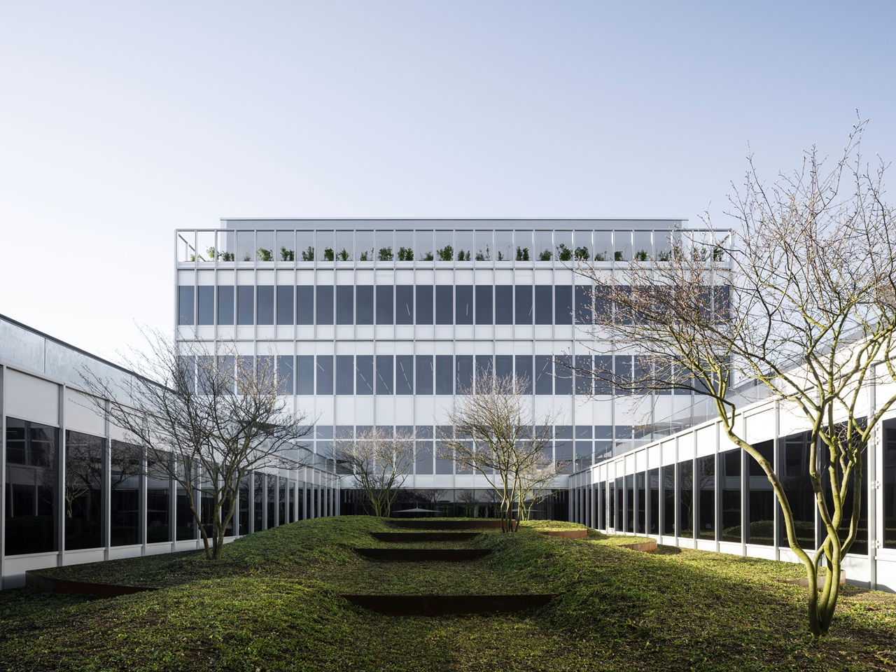 Благополучие обеспечивается продуманной организацией рабочих и переговорных зон, расположенных вокруг зеленого внутреннего двора: входы для сотрудников и посетителей сходятся к центральному пространству, задуманному как место для встреч и обмена мнениями, где расположены кафетерий, многоуровневые сиденья и большой экран с видом на двор.