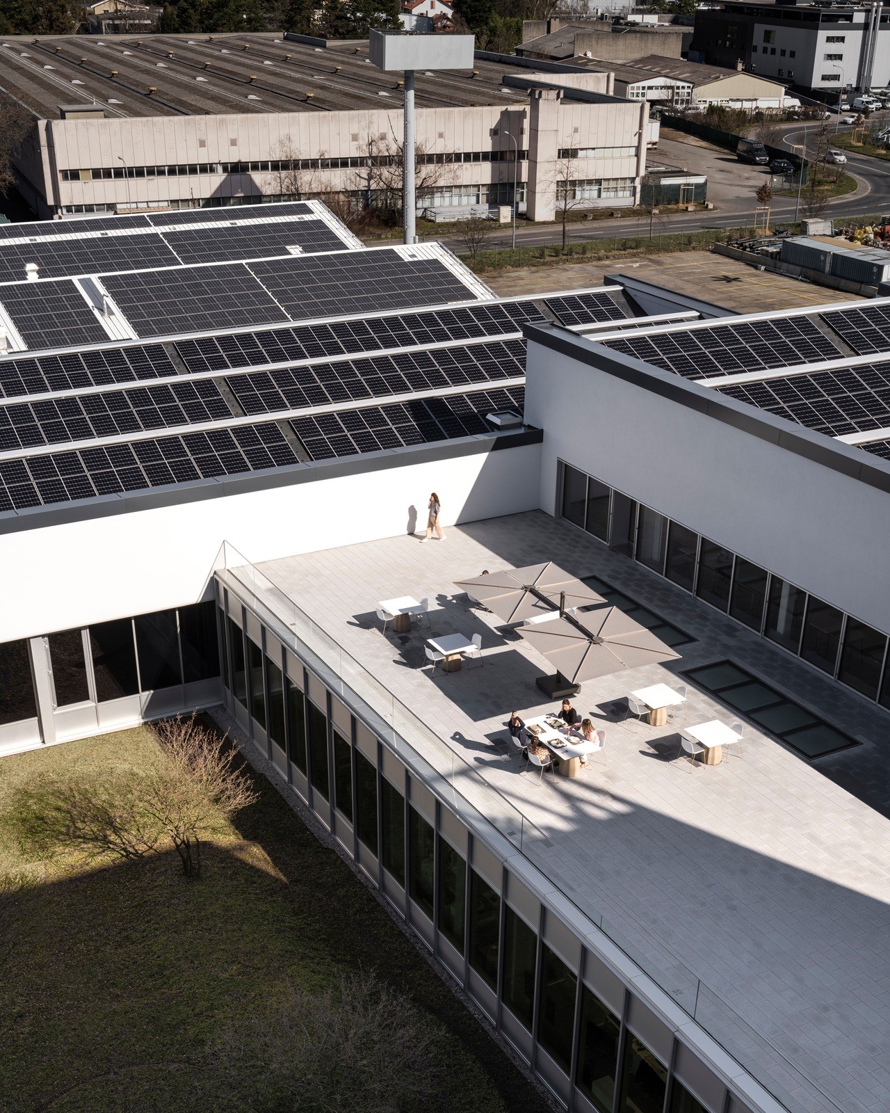Наконец, доступ к новому производственному комплексу также был разработан с учетом необходимости развития экологически устойчивой мобильности: помимо предоставления парковочных мест для сотрудников, комплекс расположен в непосредственной близости от железнодорожного вокзала Мейрана и его разветвленной сети общественного транспорта.