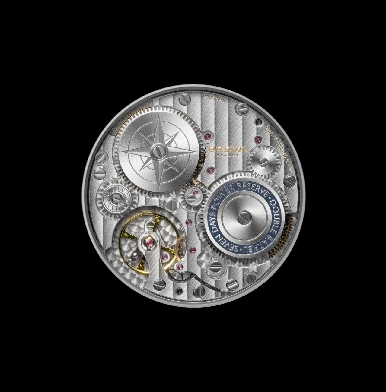 Калибр 45N09E с ручным заводом, 3-герцовым балансом и запасом хода в 7 дней от двух заводных барабанов эксклюзивно для Breva Genève создан давним другом бренда, имевшим непосредственное отношение к механизмам часов Génie 01, 02 и 03 — Жаном-Франсуа Можоном (Jean-François Mojon) и его ателье Chronode, на базе калибра C101.