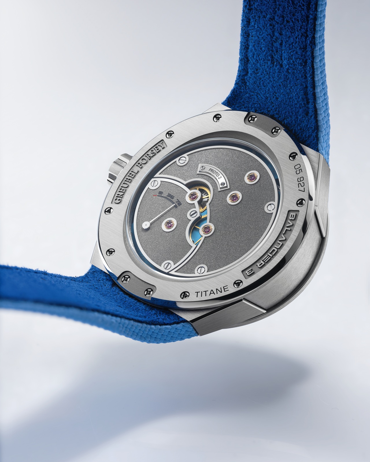 Находящийся в окружении синего фланца титановый механизм с матовым покрытием нежно-голубого оттенка акцентирует внимание на трех титановых мостах, два и которых — баланса и одного из заводных барабанов — отполированы в зеркало, а третий — центральный — предлагает инновационный для ателье стиль отделки в виде тонкой инеевой шлифовки, полученной способом ручного крацевания, выполненного при помощи металлической щетки.