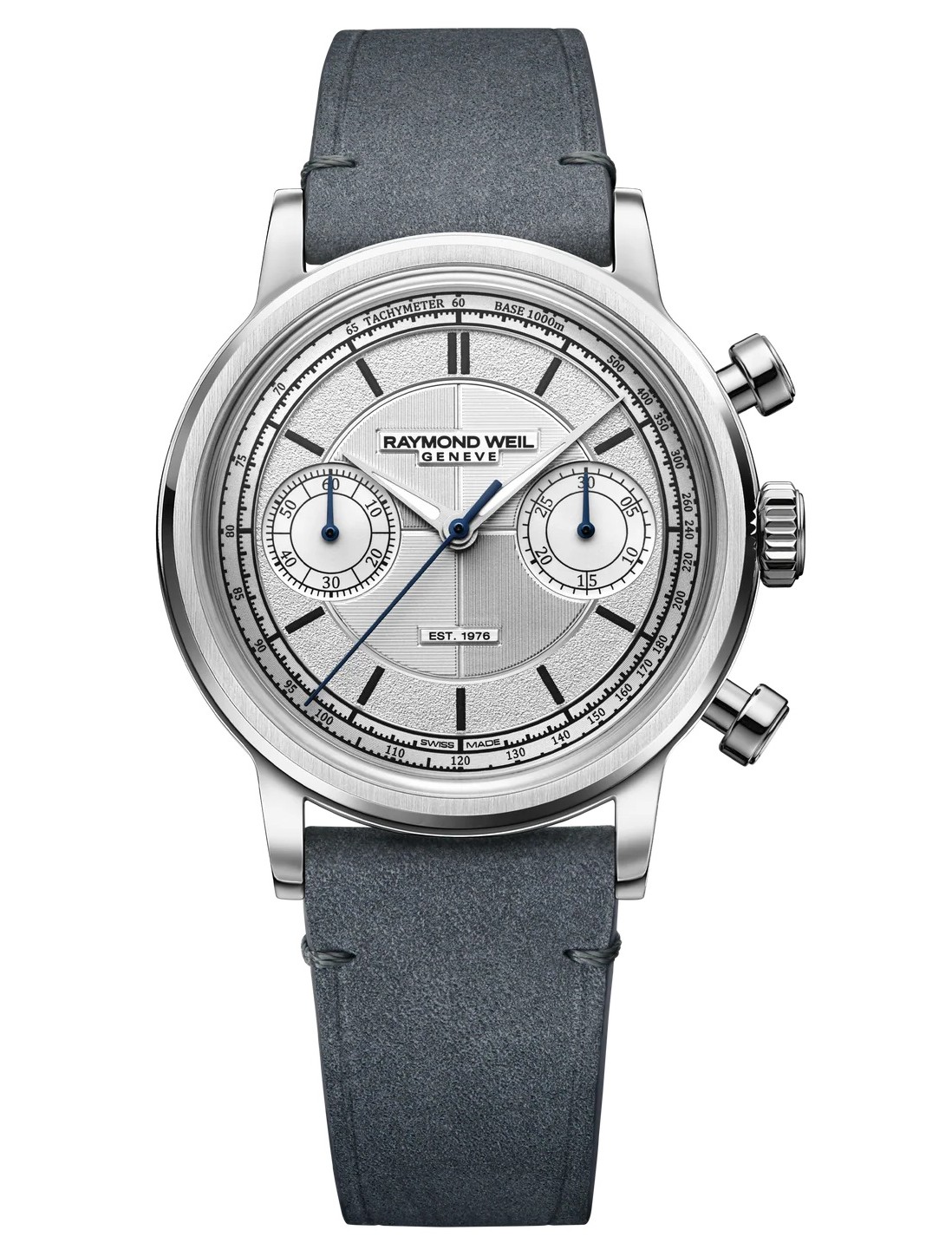 Выпуклое сапфировое стекло с внутренним антибликом защищает серебристый секторный циферблат, обрамленный тахиметрической шкалой, с парой утопленных субдайлов, с часовой разметкой на внутреннем зернистом кольце и с центральным крестообразным мотивом, демонстрирующим сочетание вертикальной и горизонтальной фактурной шлифовки.