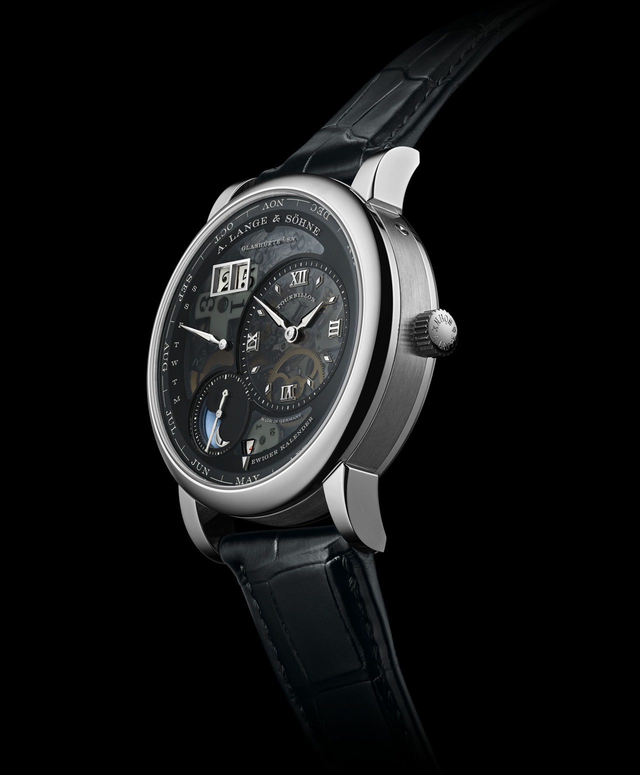 Модель Lange 1 Tourbillon Perpetual Calendar «Lumen» реализована в платиновом корпусе диаметром 41.9 мм и толщиной 13.0 мм, чью элегантность подчеркивает прошитый вручную ремешок из кожи аллигатора черного цвета, скомбинированный с платиновой застежкой.