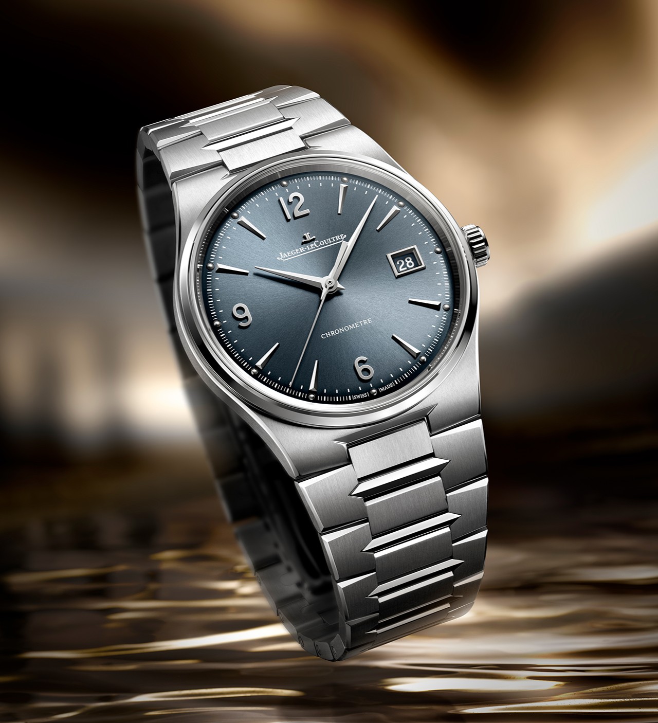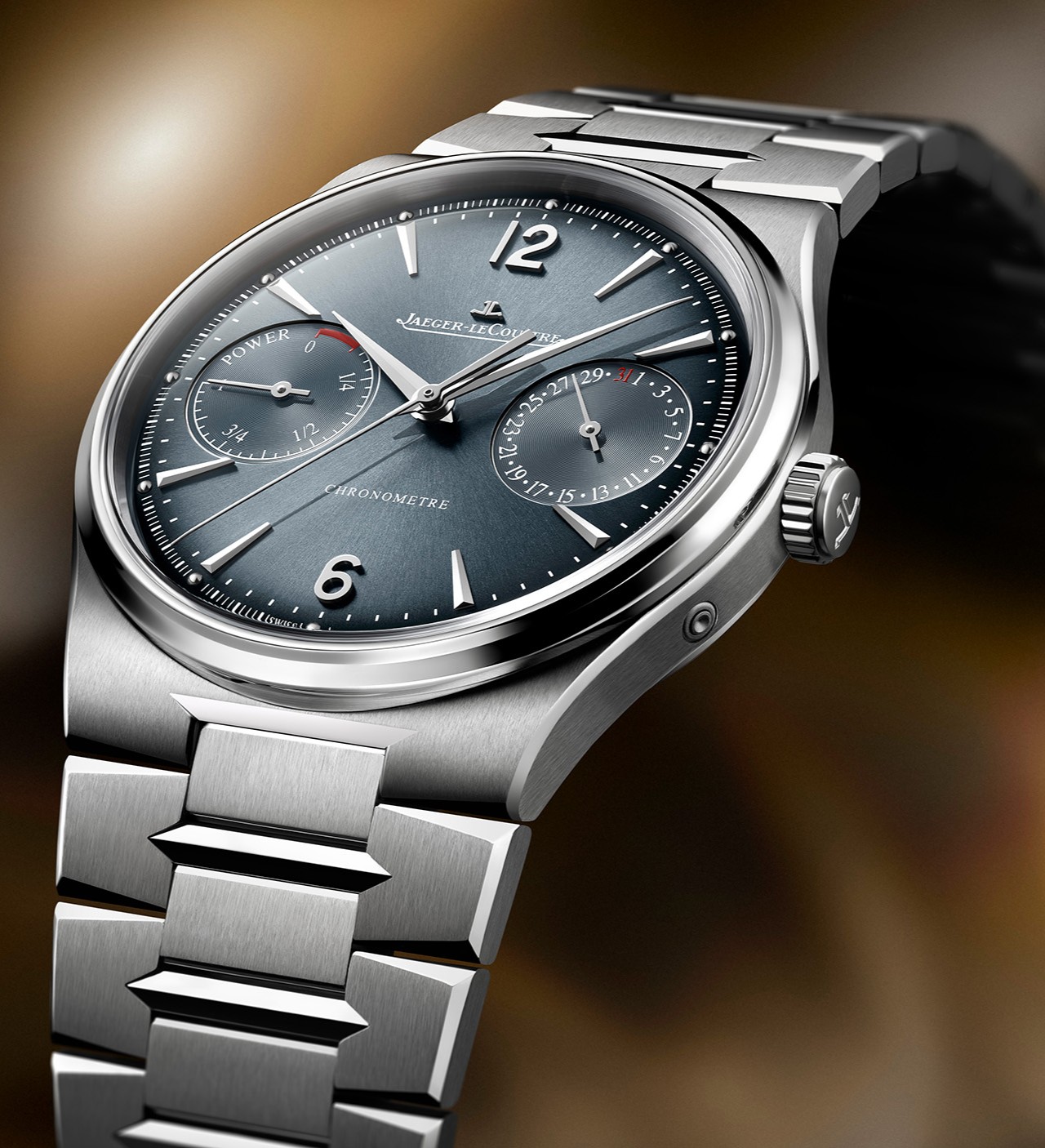 Абсолютно новые по содержанию часы — Master Control Chronometre Date Power Reserve — получили единственное стальное исполнение, где в рамки корпуса диаметром 39 мм и толщиной 9.2 мм (WR 50M) вписан серо-синий градиентный циферблат, выдержанный в стиле легендарной модели Futurematic 1951 года, с симметричными друг другу субдайлами даты и запаса хода.