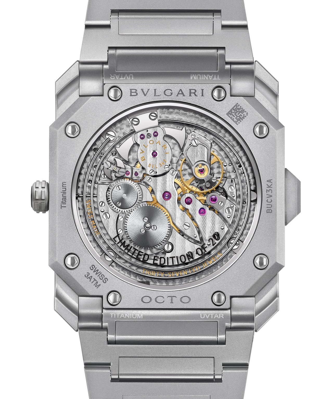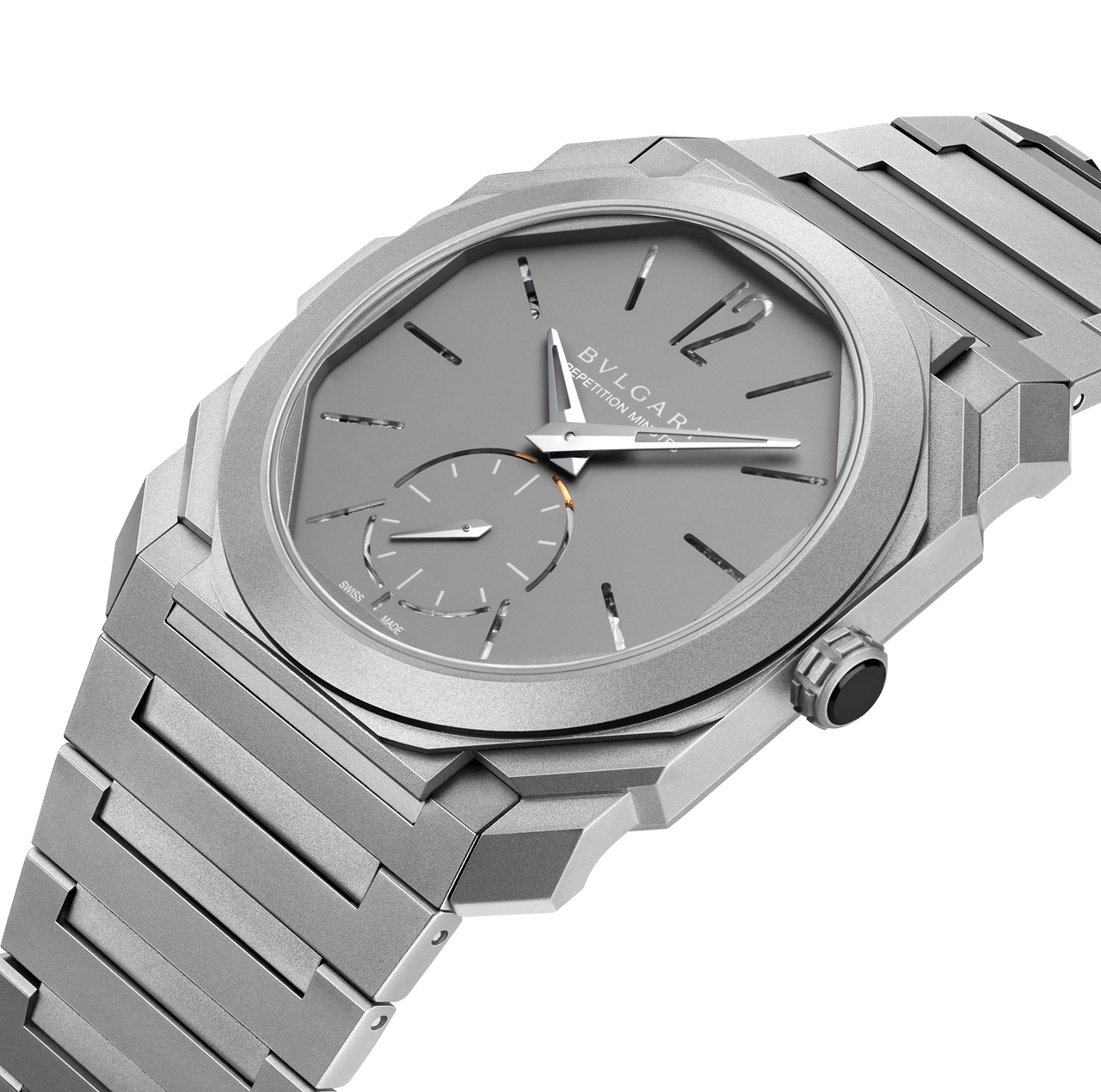 Еще одни часы, примерившие на себя 37-миллиметровый корпус толщиной 6.85 мм (WR 30M) из титана с тонкой пескоструйной отделкой — это модель Octo Finissimo Minute Repeater (ограниченная серия — 20 единиц), предлагающая функцию минутного репетира, что активируется нажатием пушера на левой боковине корпуса.