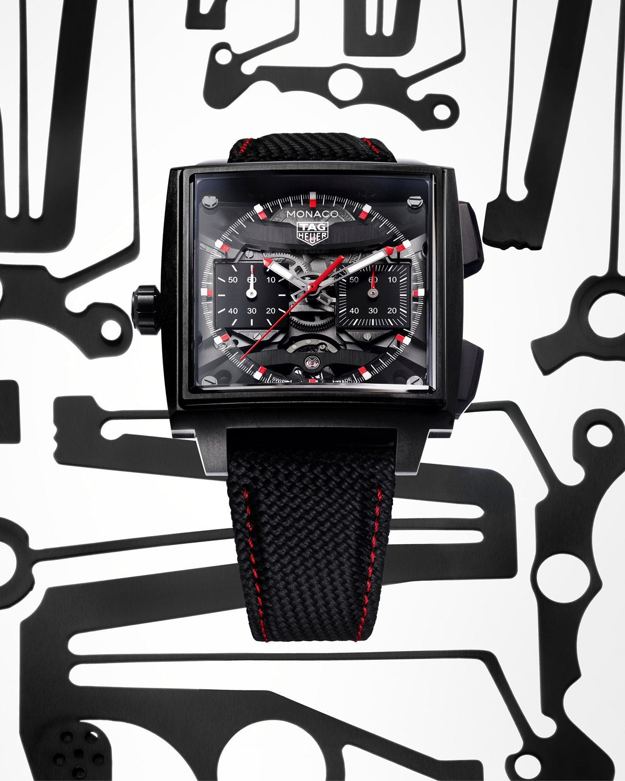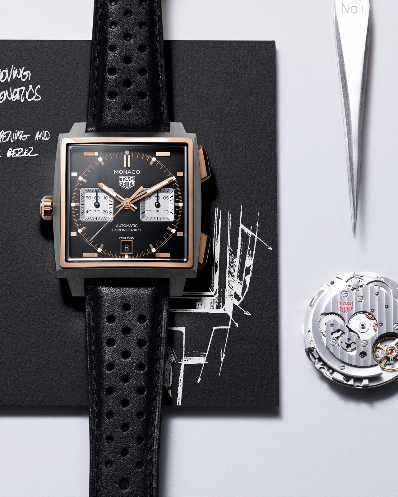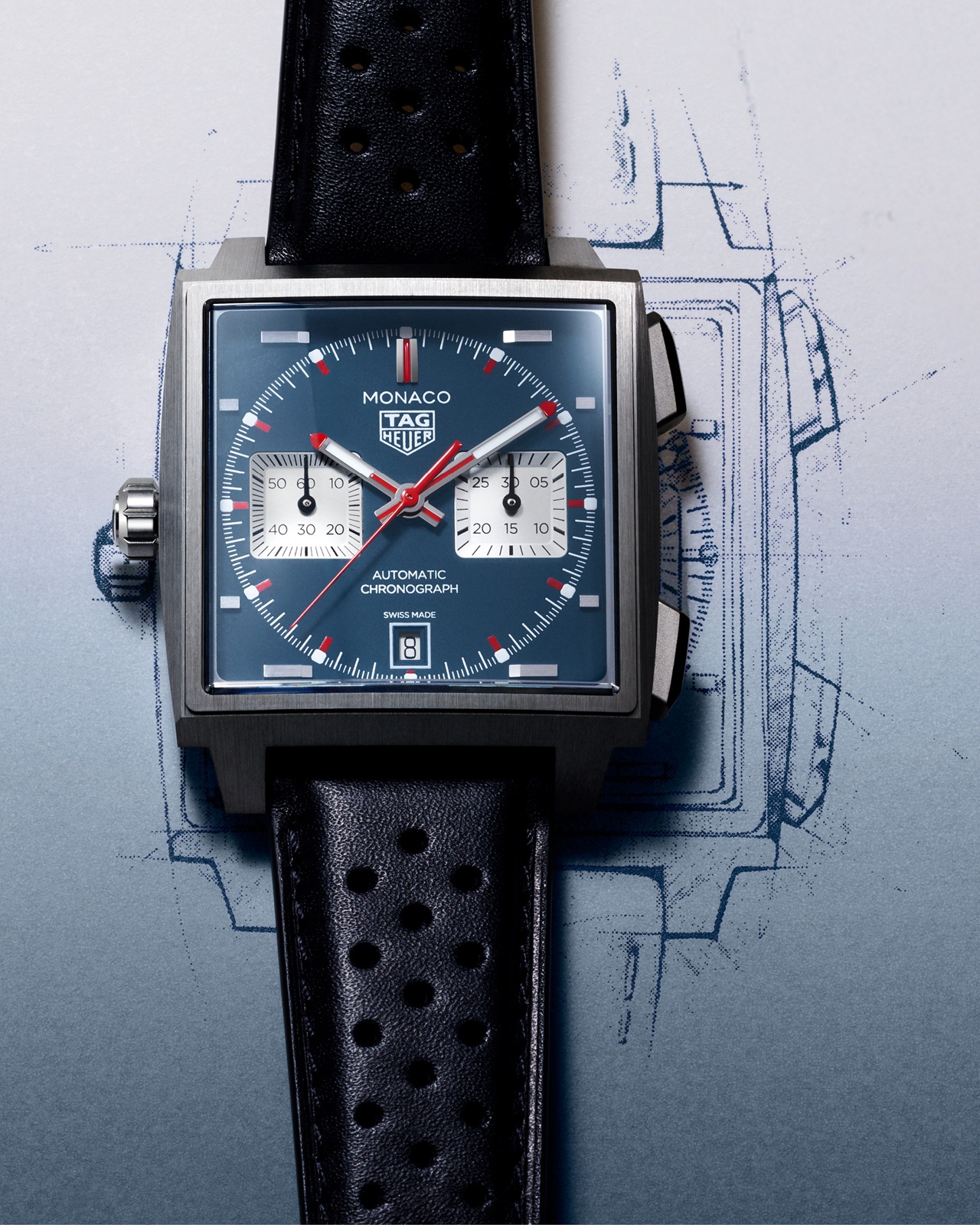 Три версии Monaco Chronograph получили новый 39-миллиметровый корпус (WR 100M) с улучшенной эргономикой, острыми гранями и квадратным сапфировым стеклом, повторяющим форму безеля, а также новую раскладывающуюся застежку с двойным предохранительным пушером, скомбинированную с перфорированным ремешком из телячьей кожи черного цвета.