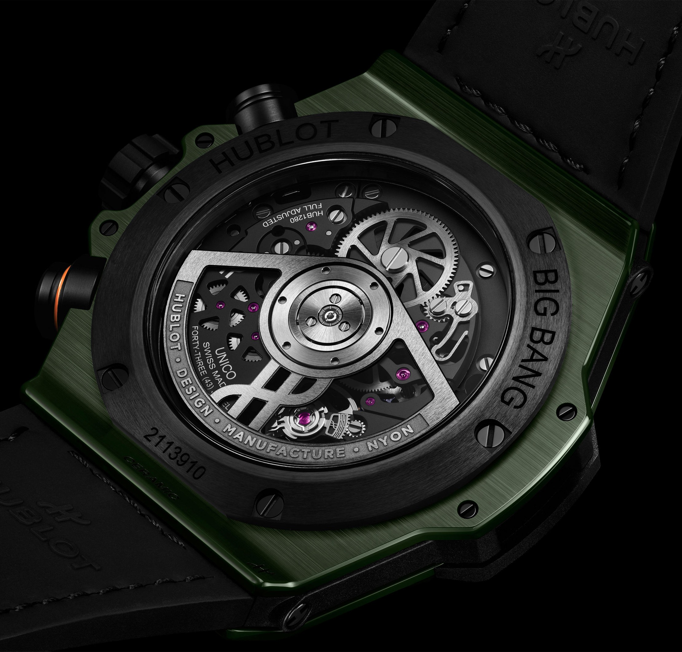 Механическим сердцем всех версий является автоматический калибр HUB 1280 (UNICO) — интегральный флайбэк-хронограф с 4-герцовым балансом, кремниевым спуском и запасом хода в 72 часа, что в составе новинок щеголяет новым вольфрамовым ротором с рельефной гравировкой «Hublot. Design. Manufacture. Nyon».