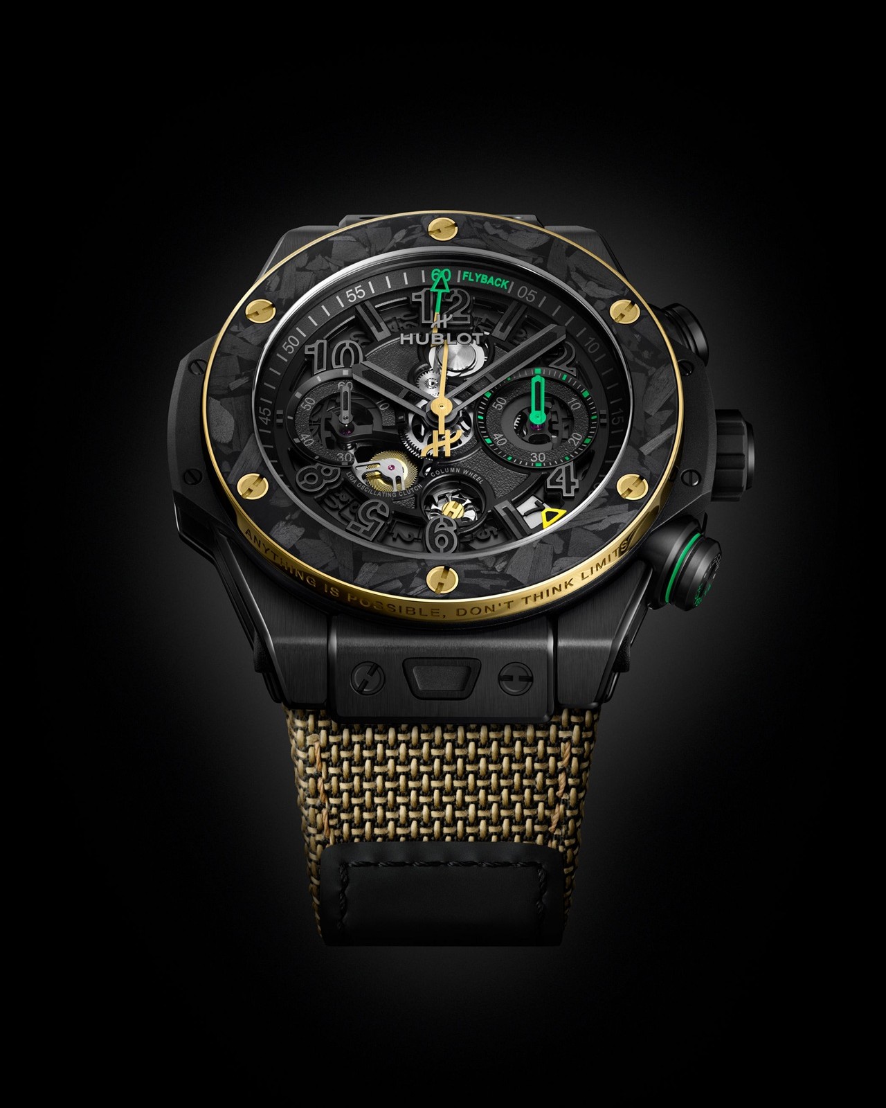 Вариант Big Bang Reloaded Usain Bolt использует корпус из черной керамики и матовый карбон в качестве материала для задней крышки и вставки безеля, что зафиксирована шестью золотыми винтами и окантована кольцом из 18-каратного желтого золота с гравировкой-слоганом «Anything is Possible, Don’t Think Limits».