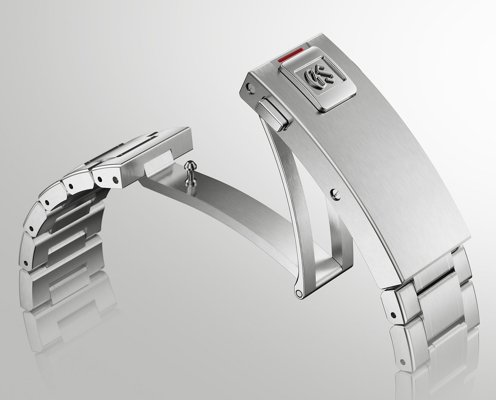 Изделие укомплектовано трехрядным титановым браслетом с новой раскладывающейся застежкой, надежная фиксация которой обеспечивается системой с двумя предохранительными пушерами и запирающим их замком в виде прямоугольной защелки с логотипом производителя.