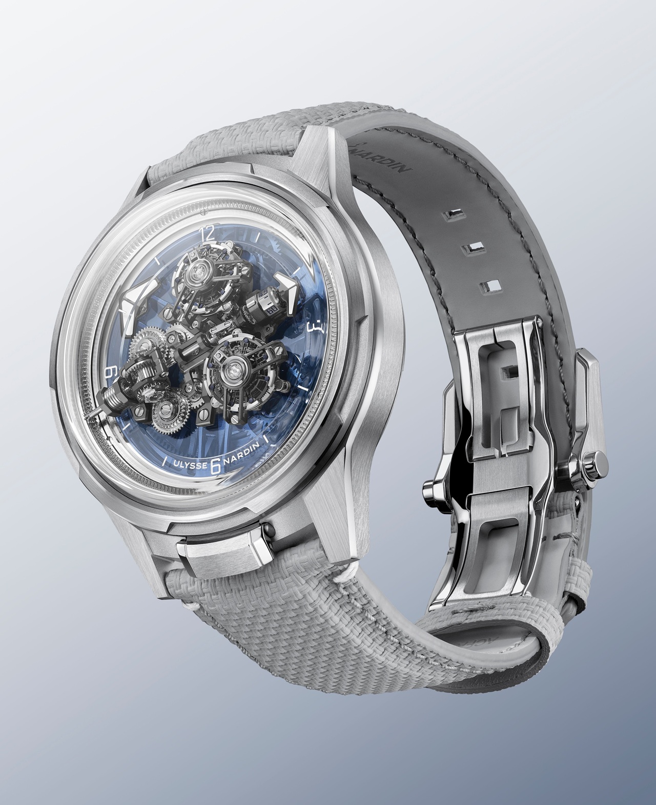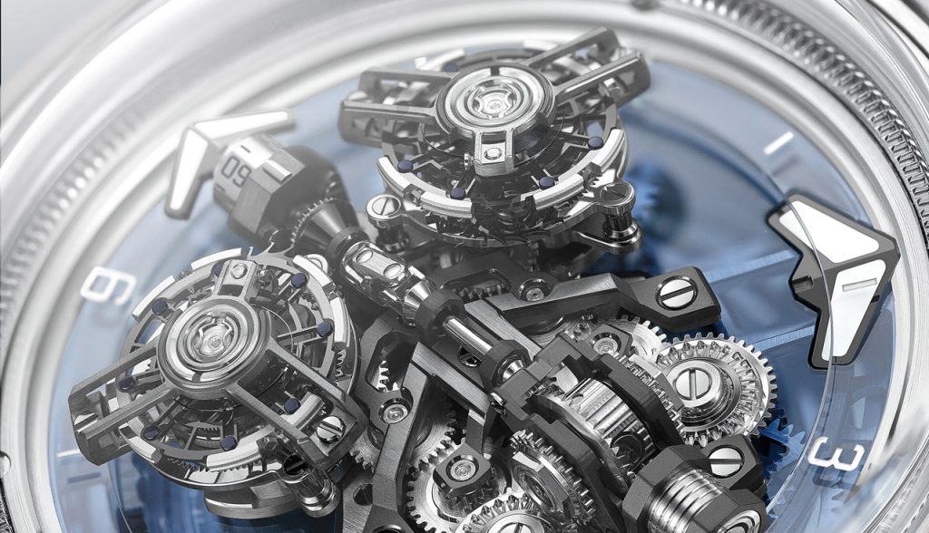 Основанием циферблата и опорой для 12-часового маркера выступает пластина из поликристаллического материала Nanosital® голубого цвета, служащая фоном для фирменного минутного моста, в состав которого входят два «парящих» титановых турбийона, с углом наклона в 10 градусов и вращением в противоположных направлениях с периодом в 60 секунд.