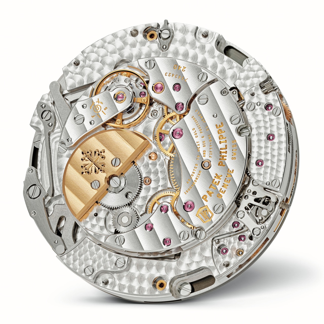 Выполнение всех заявленных функций — забота нового мануфактурного автоматического калибра 240 C LU CL LCSO (диаметр — 38 мм, высота — 7.93 мм, 51 камень, частота баланса — 21’600 пк/ч, запас хода — 38…48 часов), базой для которого выступает проверенный временем 240-й калибр с золотым микро-ротором и фирменным клеймом качества Patek Philippe Seal.